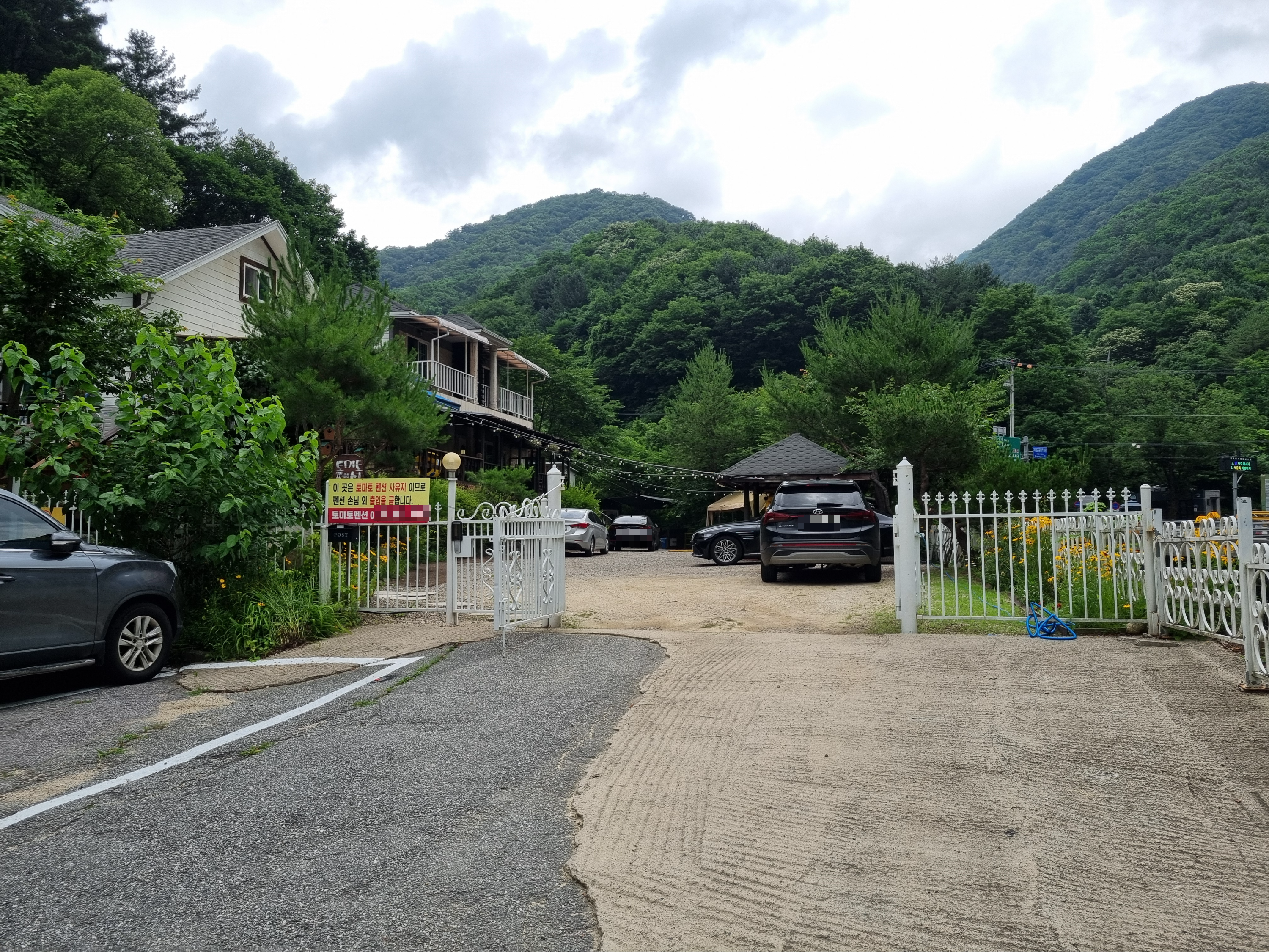 1만원을 지불하면 펜션에 주차가 가능해요. 주차 후 펜션 안에 있는 쪽문을 이용하면 편하게 계곡 포인트 지점으로 내려갈 수 있다는 장점도 있어요.