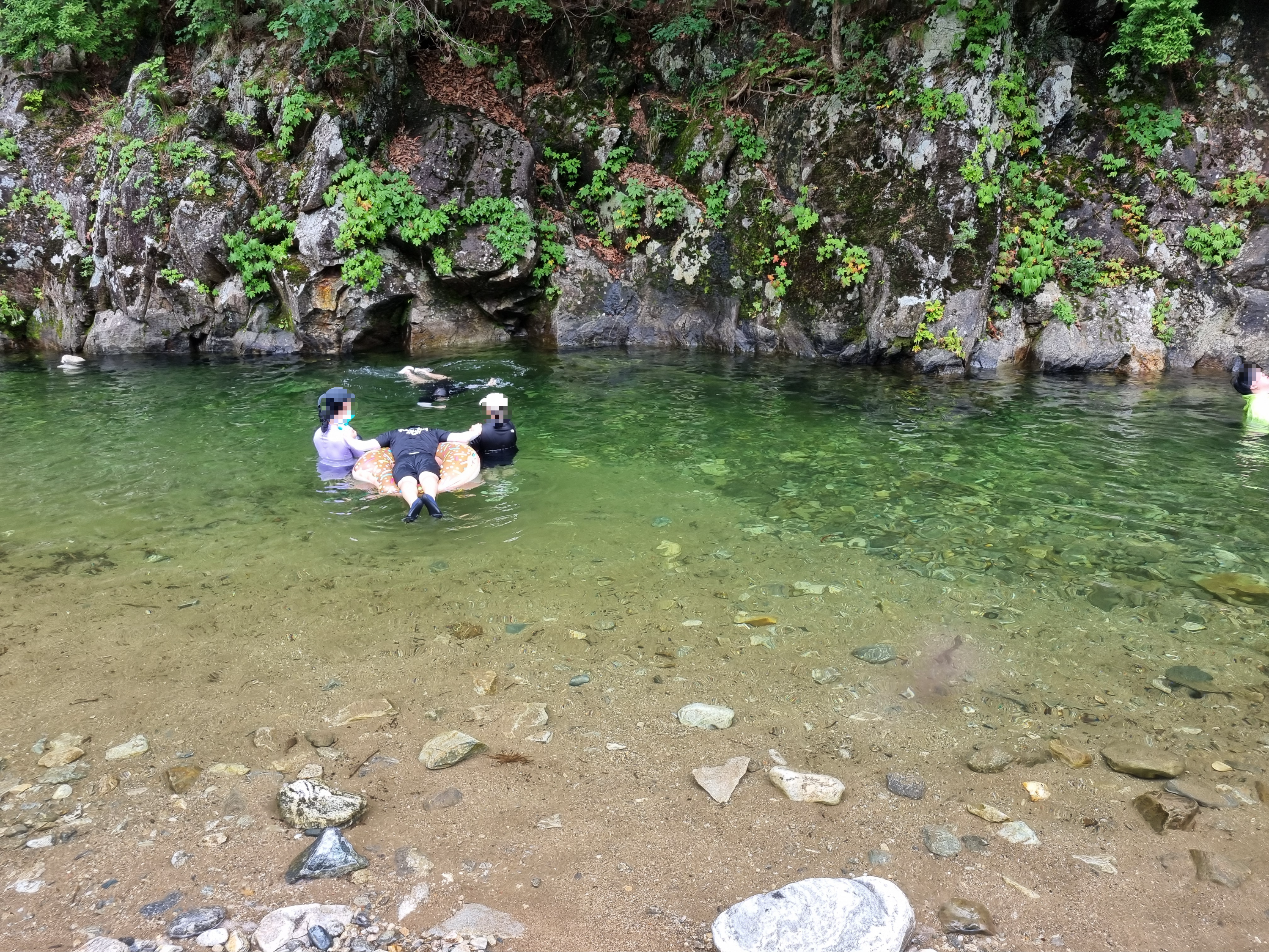 한 가족들이 계곡 한가운데에서 튜브를 타며 여유롭게 즐기고 있는 모습이에요. 수심도 적당하고 물살도 세지 않아 안전하게 놀 수 있었어요. 바위 절벽 아래쪽은 조금 더 깊은 편이라 수영을 즐기는 사람들에게 안성맞춤이에요. 계곡 전체적으로 맑은 물이 흐르고 있어서 물놀이 내내 기분이 상쾌했어요.