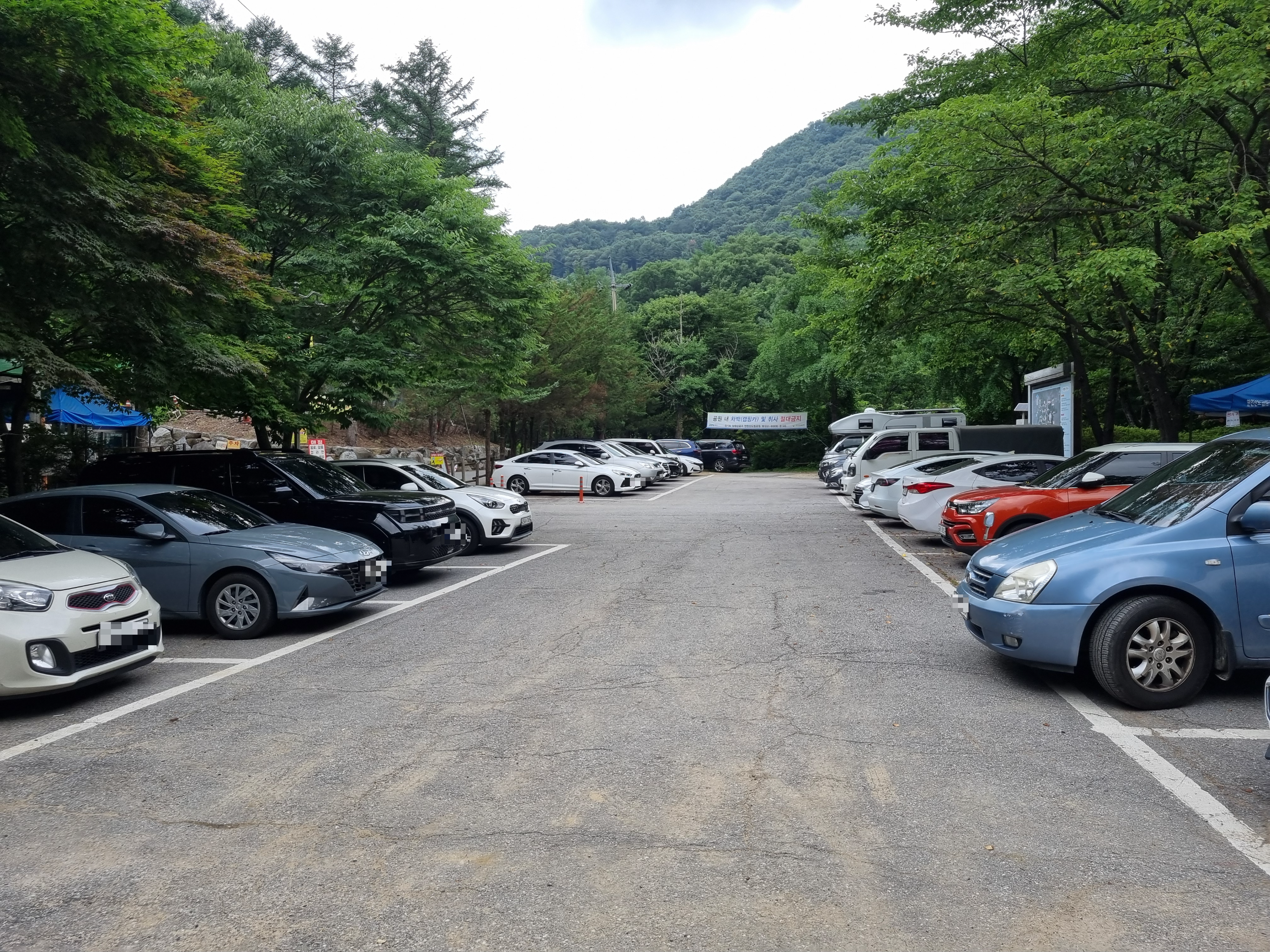 '용추쉼터임시주차장'을 검색해서 찾아가면 위와 같이 넓은 주차장이 나와요. 계곡 바로 옆에 위치해 있어서 짐 들고 이동하기도 편했고요. 주차요금도 무료이다보니차가 거의 꽉 차있었어요.