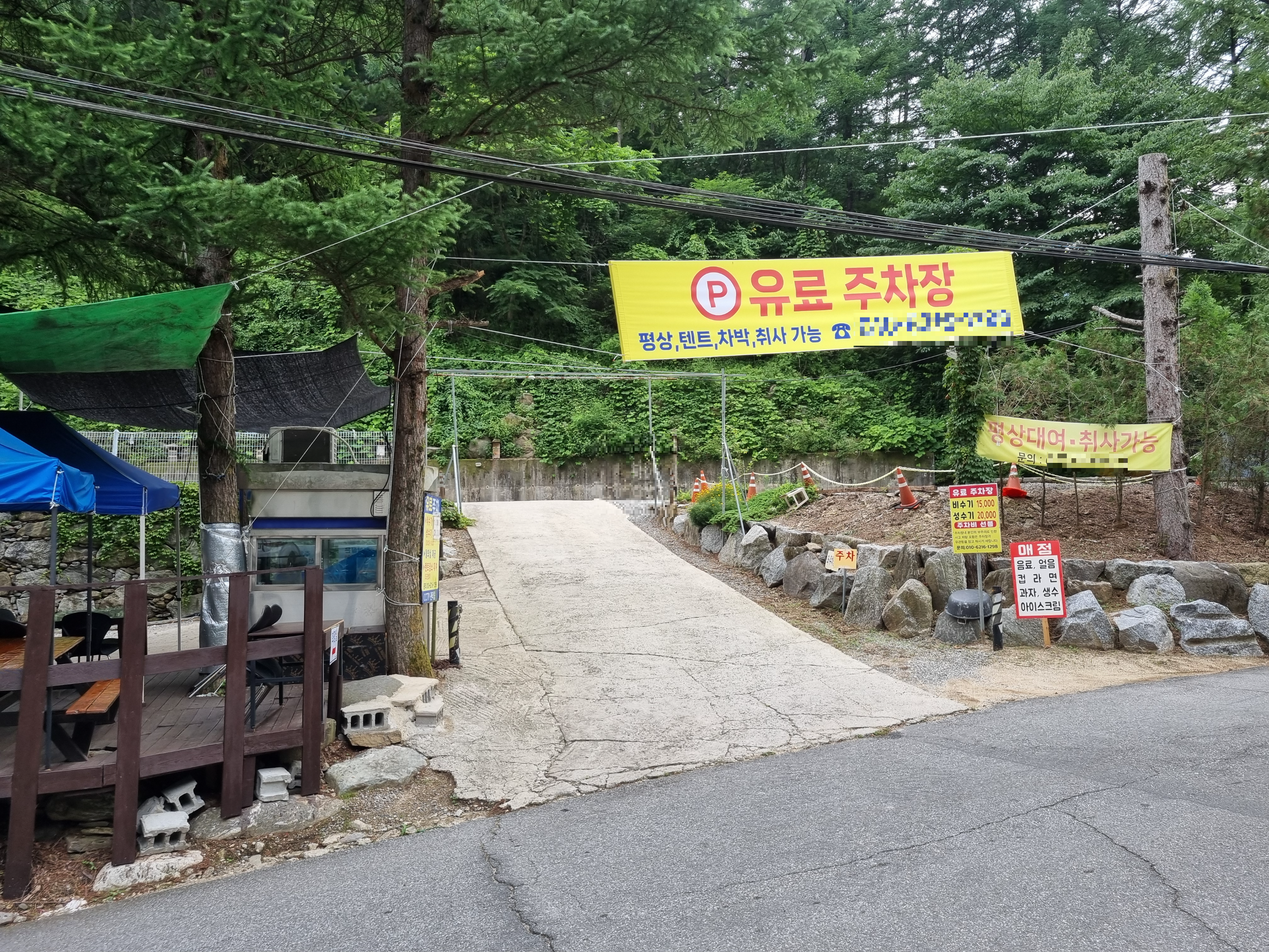 무료주차장 바로 맞은편에는 개인이 운영하는 유료 주차장이 있어요. 텐트, 차박, 평상대여에 취사도 가능하다고 하니 하루 종일 놀거나, 캠핑 겸 휴식을 취하기 좋아보여요. 매점도 있어서 음료수, 컵라면, 과자, 아이스크림 등 간식도 살 수 있더라고요. 주차비는 비수기에는 15,000원, 성수기는 20,000원이고 선불로 내야해요.