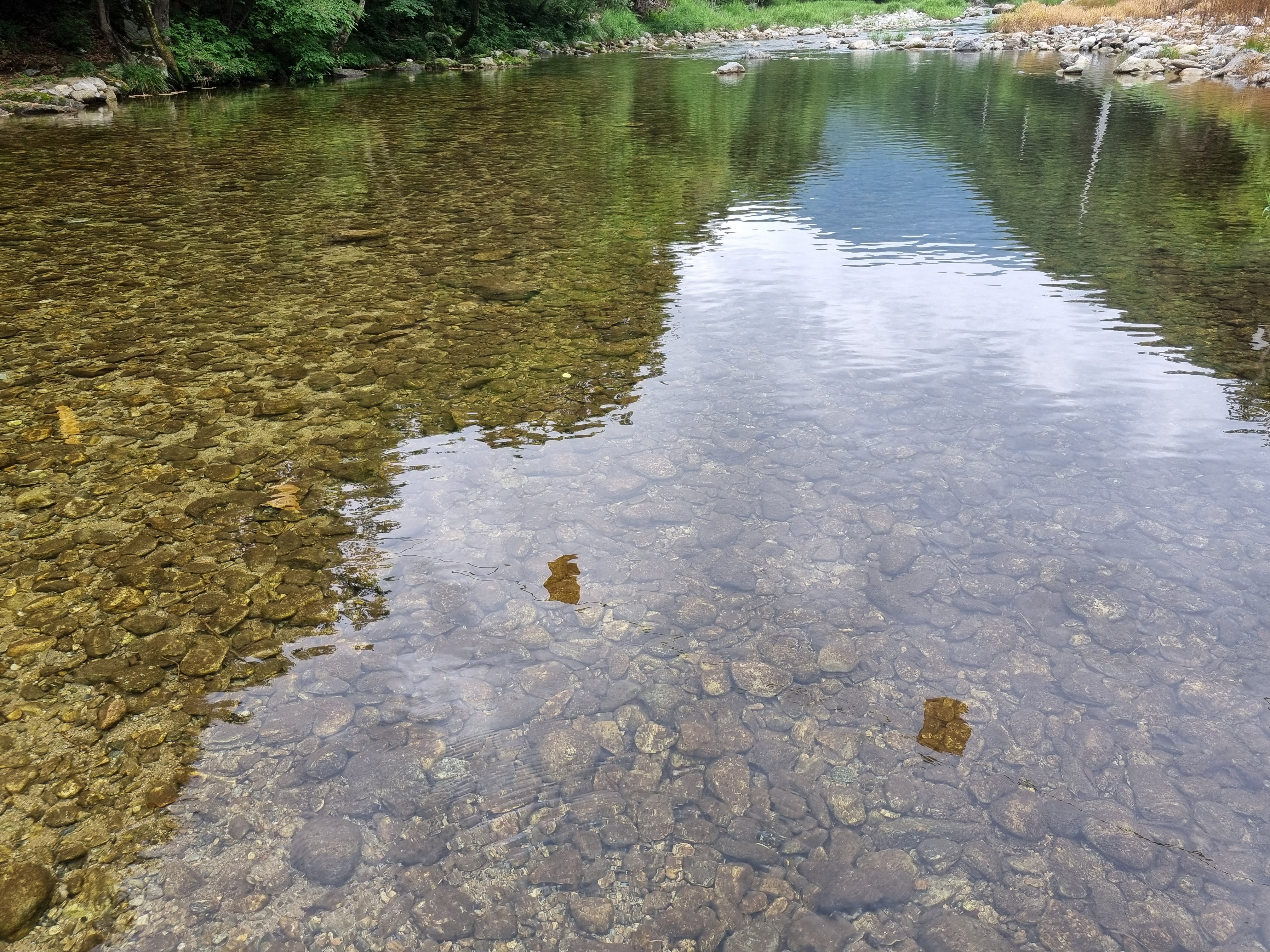 윗쪽으로 올라서면 보이는 넓게 펼쳐진 평평한 물가에는 바닥이 온전히 드러날 정도로 맑은 물이 고요하게 흐르고 있어요. 물속 자갈이 그대로 비쳐 마치 어항을 들여다보는 듯한 느낌을 주며, 수심은 무릎 아래 정도로 낮아 아이들과 물놀이하기 좋아요.