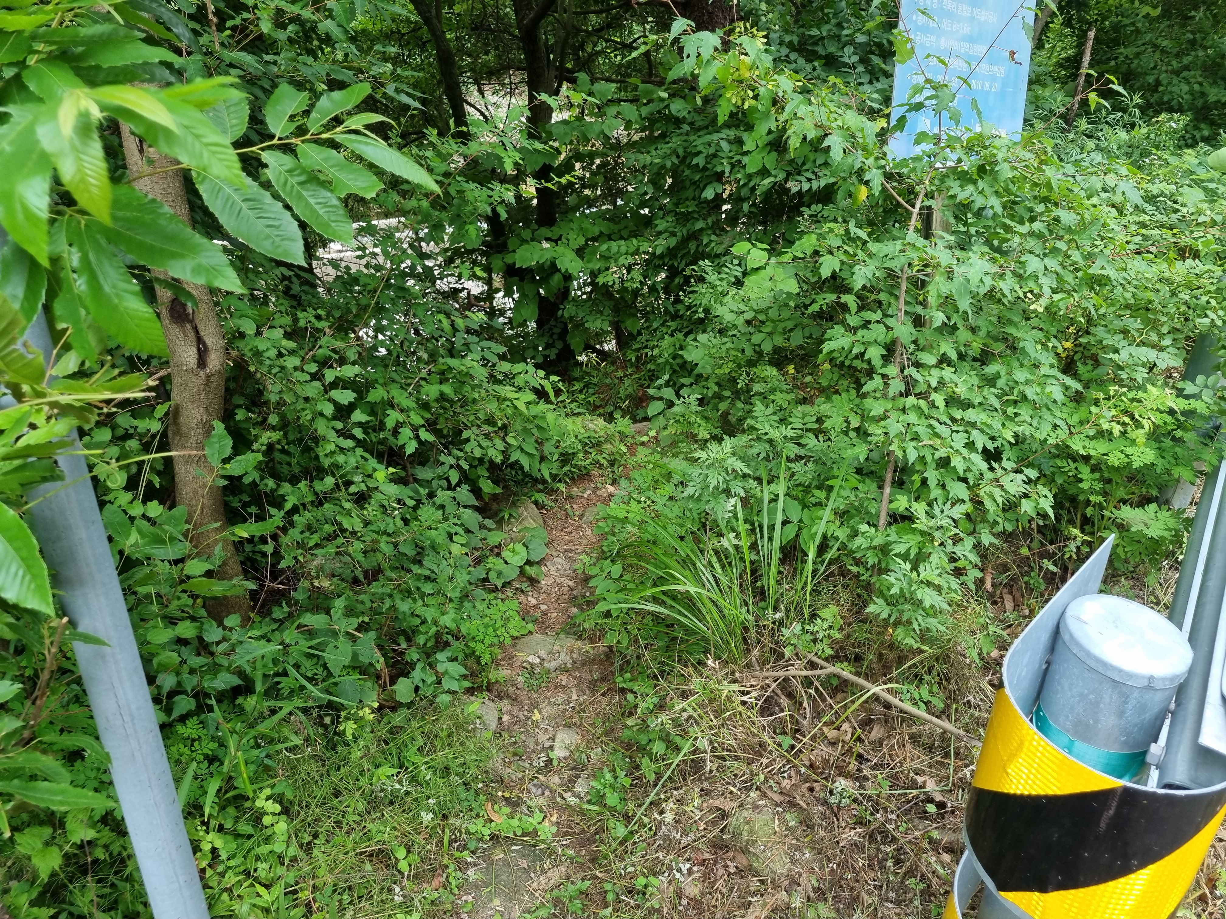 주차 후 가드레일 끝으로 가면 바로 이런 좁은 길이 보이는데요, 이곳이 계곡으로 들어가는 초입이에요. 표지판이나 안내는 따로 없고, 사진처럼 수풀 사이로 난 오솔길이 유일한 단서예요. 처음 방문하시는 분이라면 '이 길이 맞나?' 싶을 정도로 숨겨져 있지만, 길을 따라 들어가면 바로 물소리가 들려서 안심하실 수 있어요. 주변은 전부 초록으로 뒤덮여 있어서 숲속 탐험 느낌도 물씬 납니다!