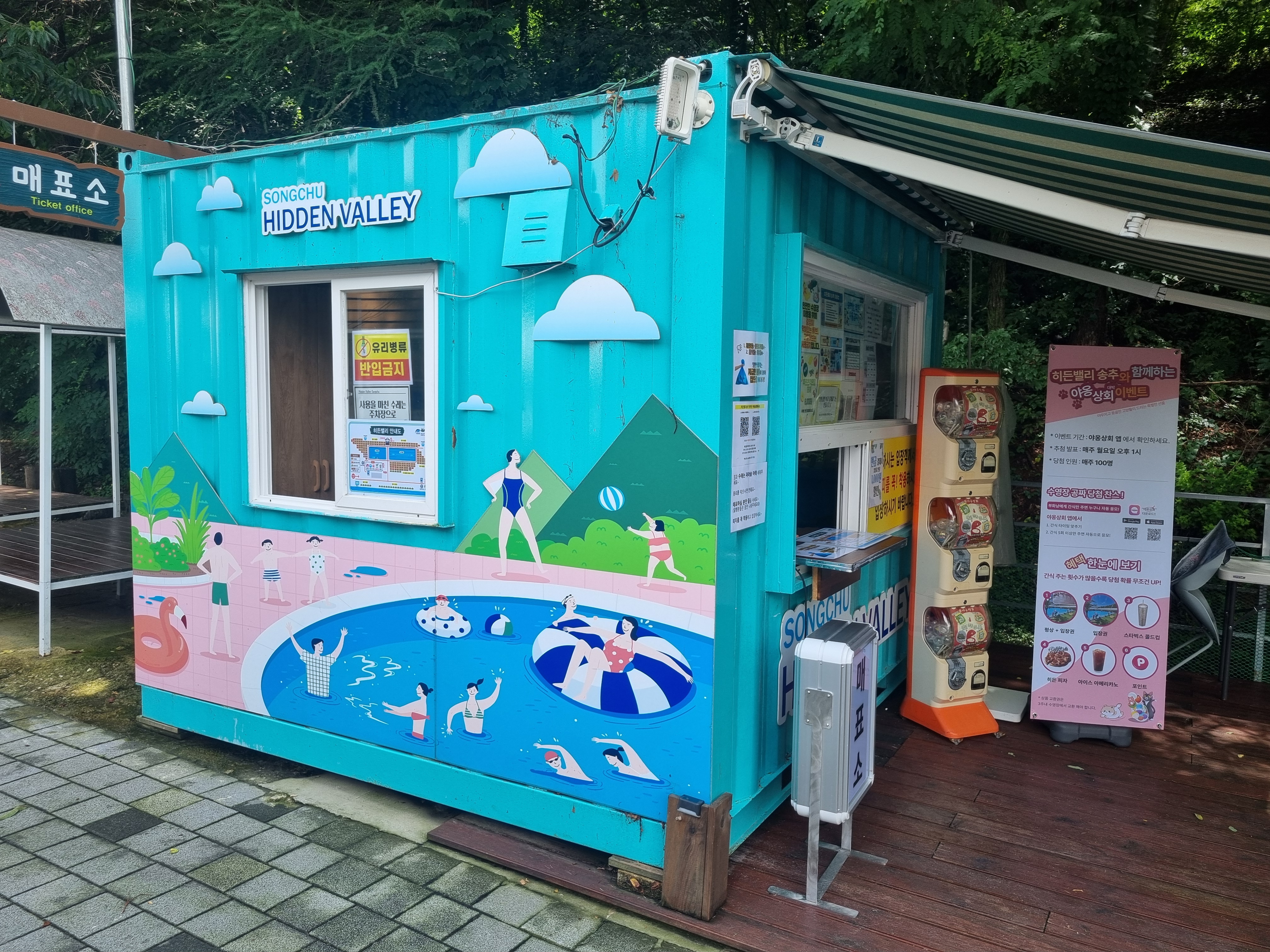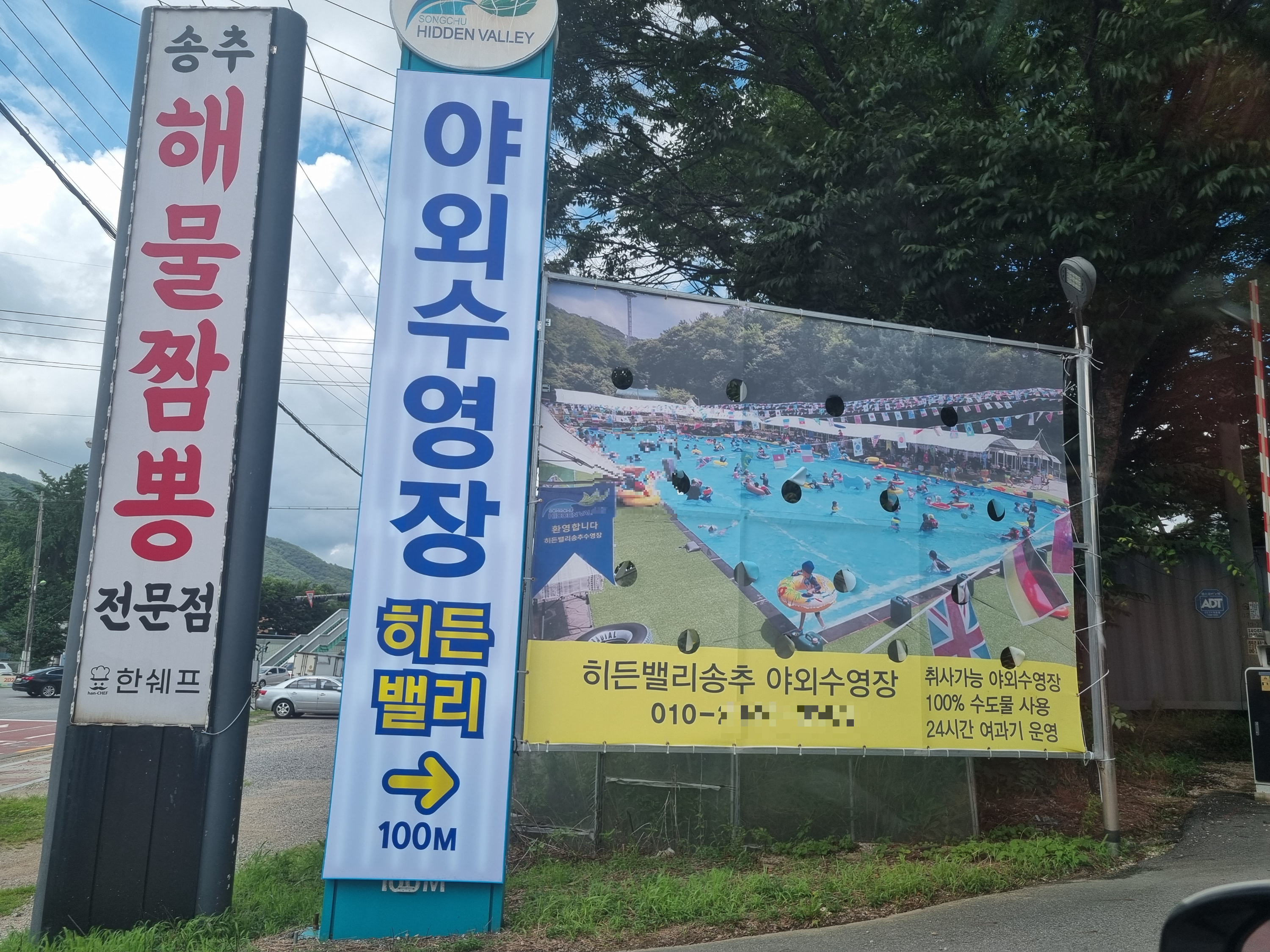 입구에 도착하자마자 눈에 띄는 건 히든밸리송추 야외수영장 입간판이에요.골목길을 따라 100m 정도만 들어가면 수영장이 바로 나타나요. 100% 수돗물 사용에 24시간 여과기 운영이라는 문구를보니 안심하고 물놀이를 즐길 수 있을 것 같아요.