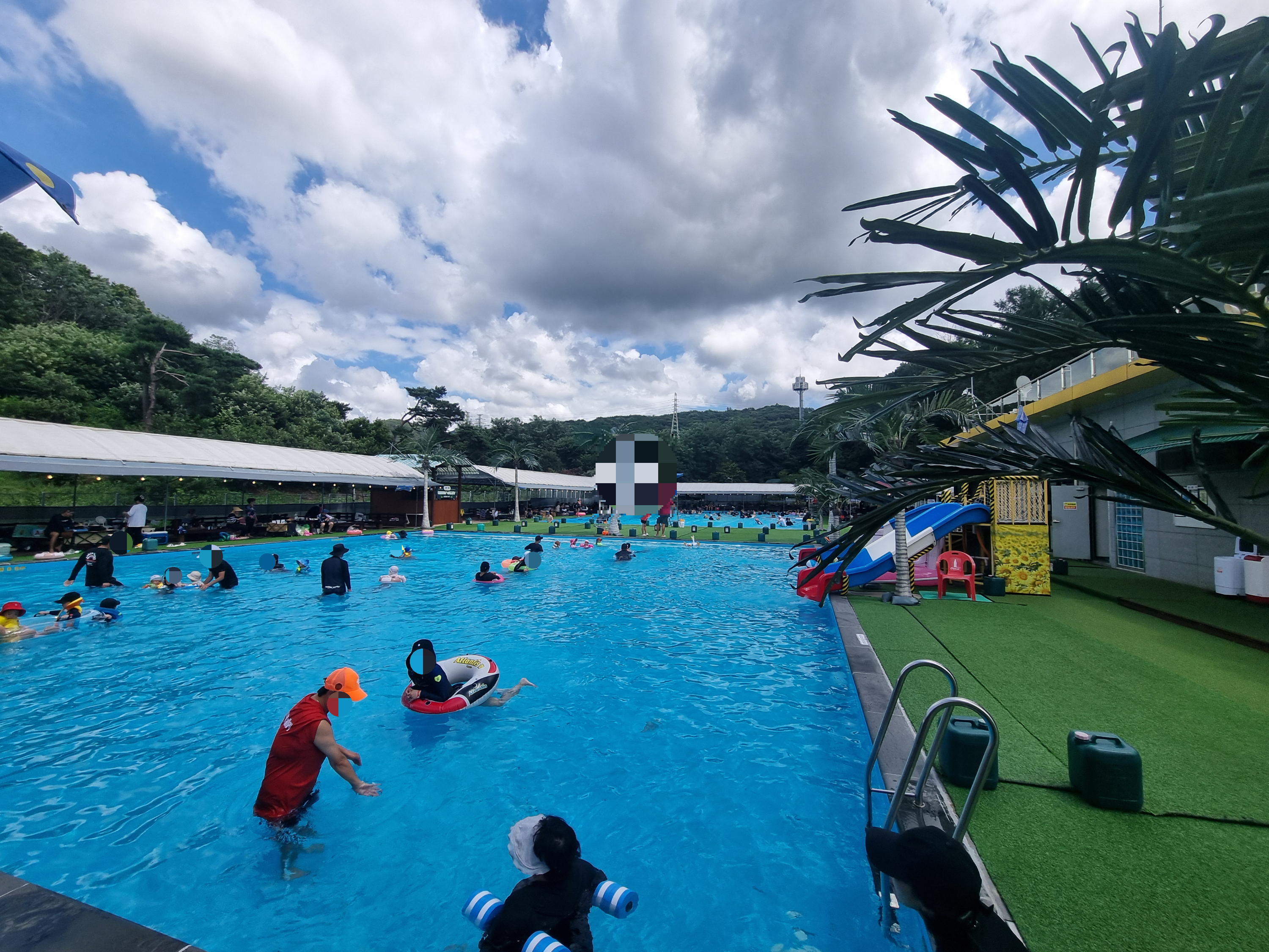 인공야자수와 멀리 보이는 초록빛 산자락 덕분에 도심에서 벗어난 듯한 느낌이 들더라고요. 수질도 깨끗하고 여과기도 계속 작동 중이라 물 상태가 좋았고, 수심이 균일해서 걱정 없이 물놀이를 즐길 수 있어요. 입장 인원 조절도 잘 되어 붐비지 않고 쾌적했어요.