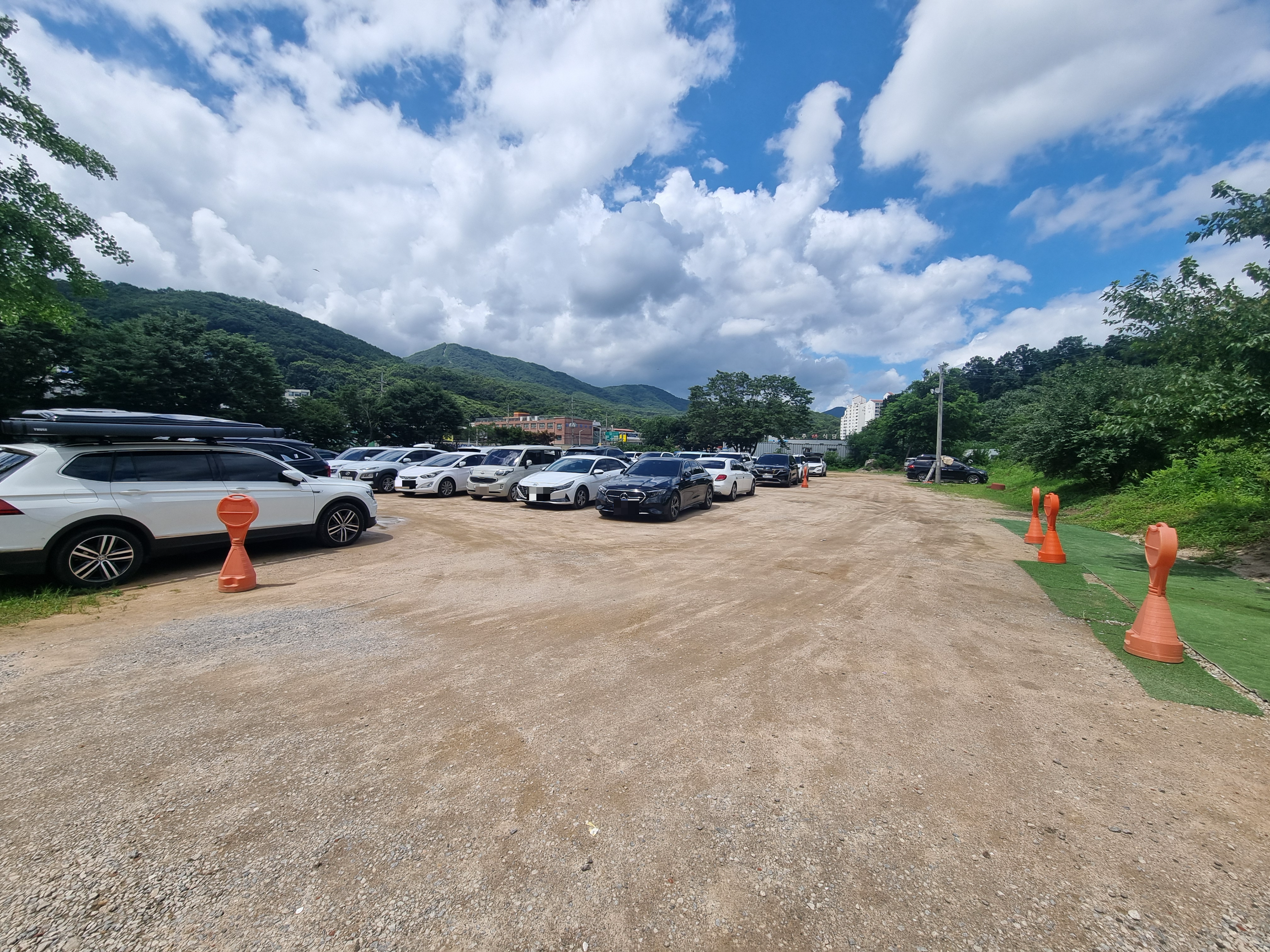 도착하자마자 넓은 주차장이 반겨줍니다. 비포장 주차장이지만 차량이 여유 있게 들어갈 수 있을 만큼 공간이 넓어요. 주차 요금도 별도로 없고, 짐을 옮길 수 있는 수레가 있어서 무거운 짐 옮기기에도 부담 없어요.