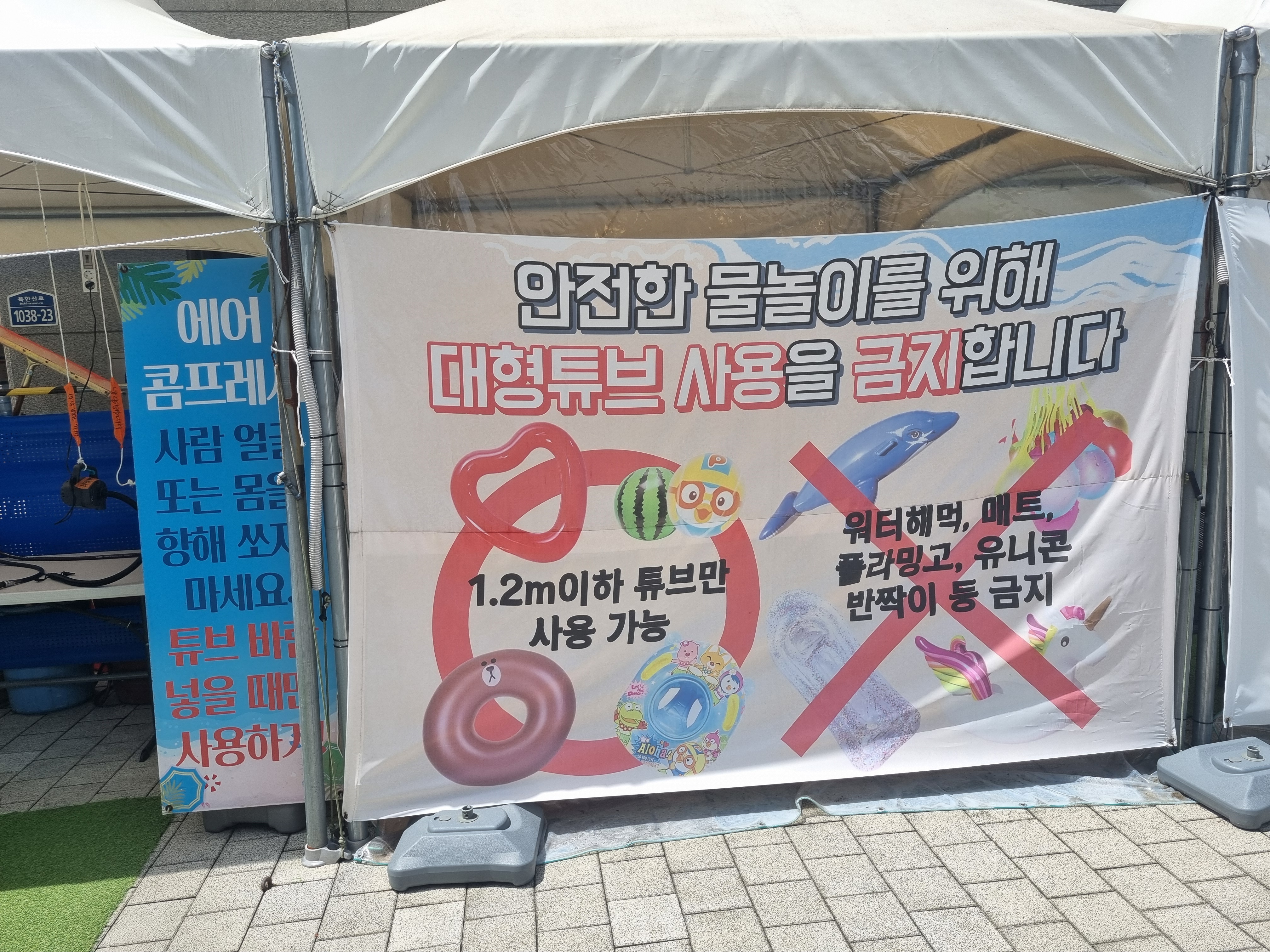 수영장 내부에는 대형 튜브나 워터해먹, 유니콘, 플라밍고 등 부피 큰 물놀이 기구는 반입 금지에요. 1.2m 이하 튜브만 사용 가능하다고 하니, 사전에 확인하고 준비하는 것이 좋겠어요.