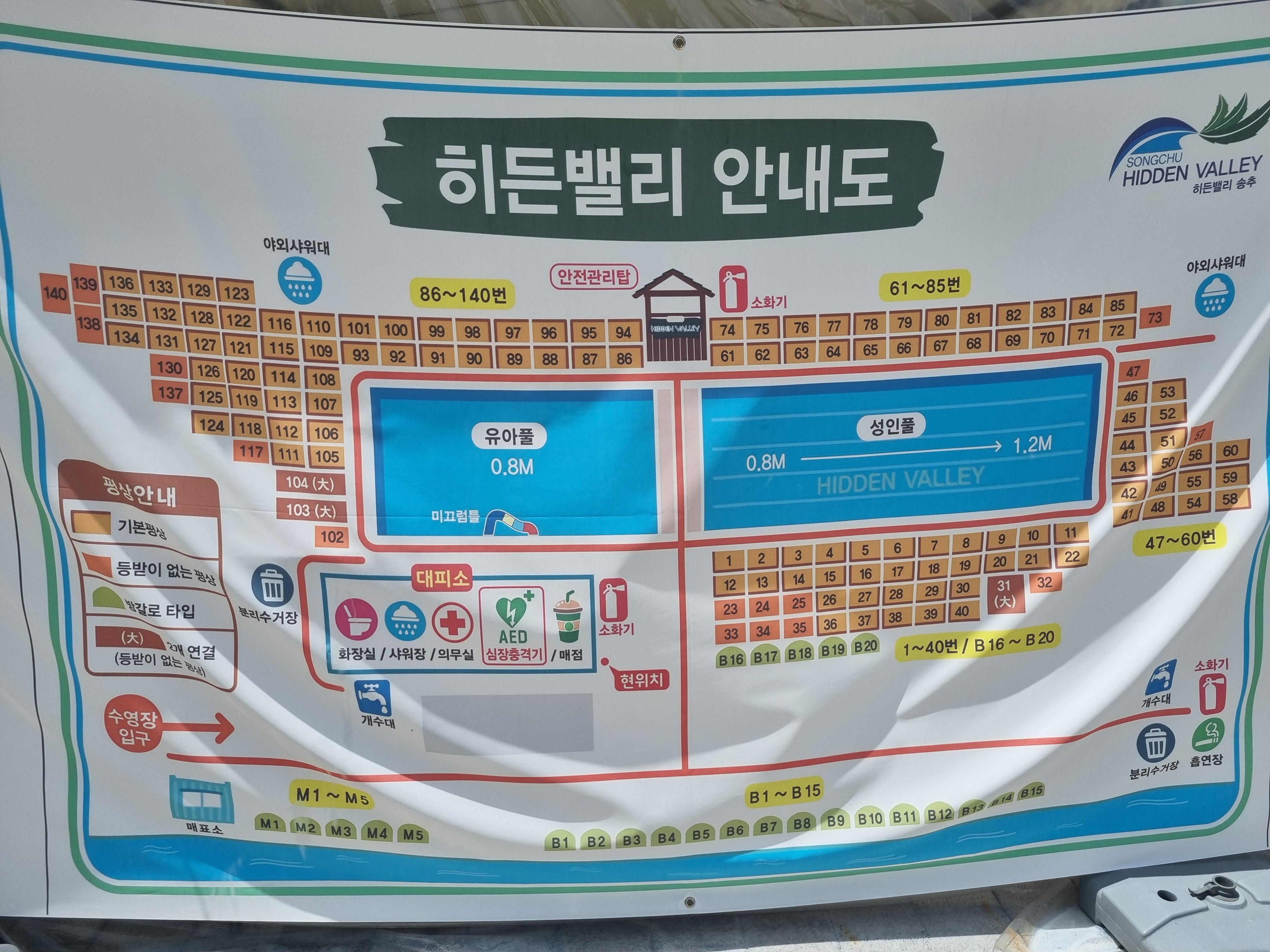 히든밸리 전체 안내도가 한눈에 들어오도록 정리되어 있어요. 유아풀(0.8m)과 성인풀(0.8~1.2m)로 구분되어 있으며, 각 구역별 평상 번호와 위치도 상세히 안내되어 있어요. 평상은 야옹상회라는 어플로 예약해야하는데 평상은 기본형, 등받이형, 방갈로 타입으로 다양하게 선택할 수 있었고, 위치에 따라 좋은 자리가 나뉘니 잘 보고 선택해야돼요.