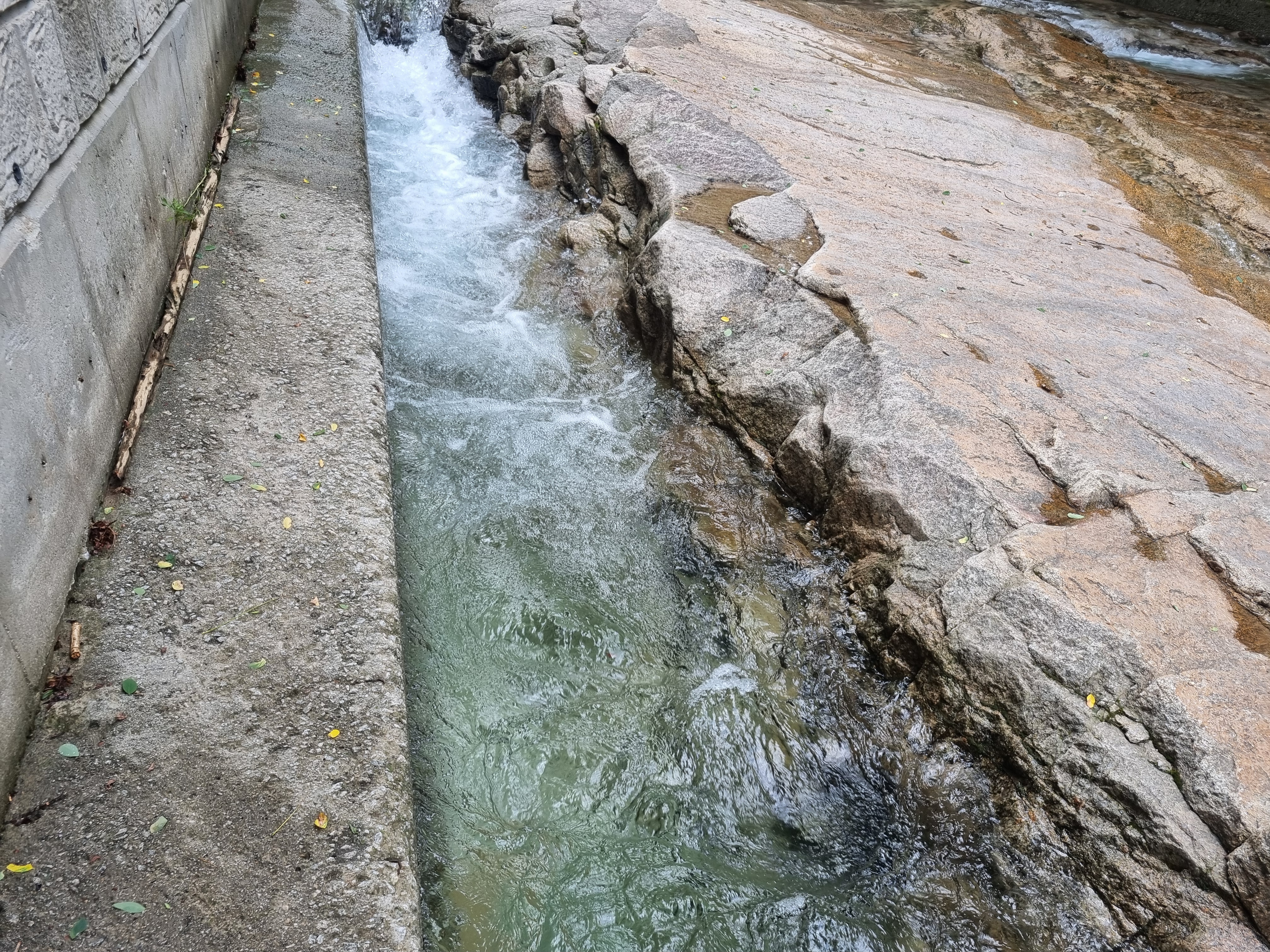 여긴 계곡에서 갑자기 수로처럼 좁아지는 구간이에요. 물살이 세게 흐르기때문에 조심해서 수로에 발을 담그면 자동 맛사지를 받는 기분이들어요. 물살이 시원하게 흐르니, 보기만 해도 더위가 싹 가시는 느낌이에요.