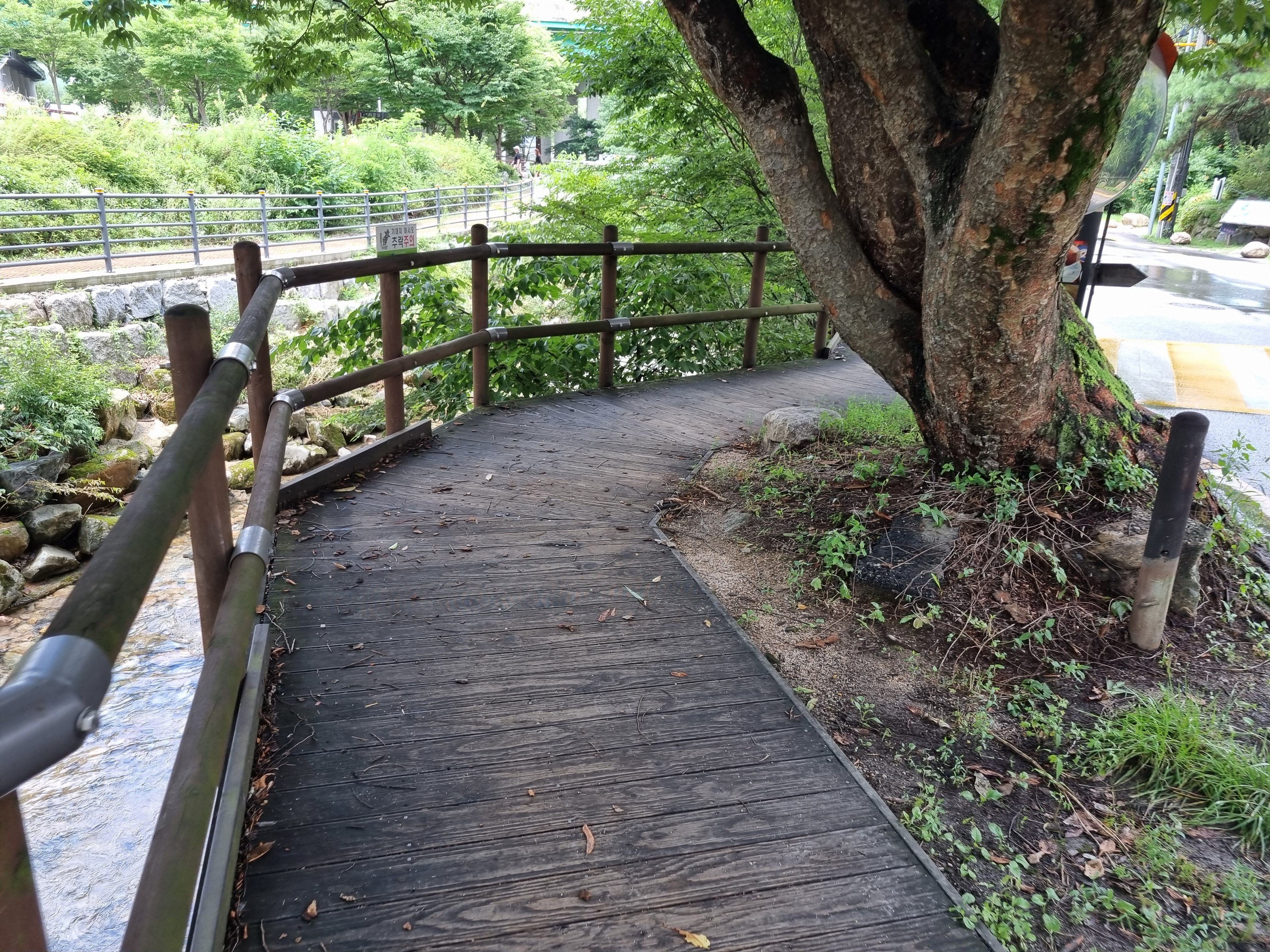 주차장에서 나와서 상류로 걸어가면 이렇게 멋진 나무 데크 산책로가 이어져요. 길 바로 옆으로는 맑은 계곡물이 졸졸 흐르고 있어서 올라가는 길이 지루할틈이 없어요. 이길을 따라서 10~15분 정도 위로 올라가면 송추계곡 수심깊은 스팟이 나온답니다.