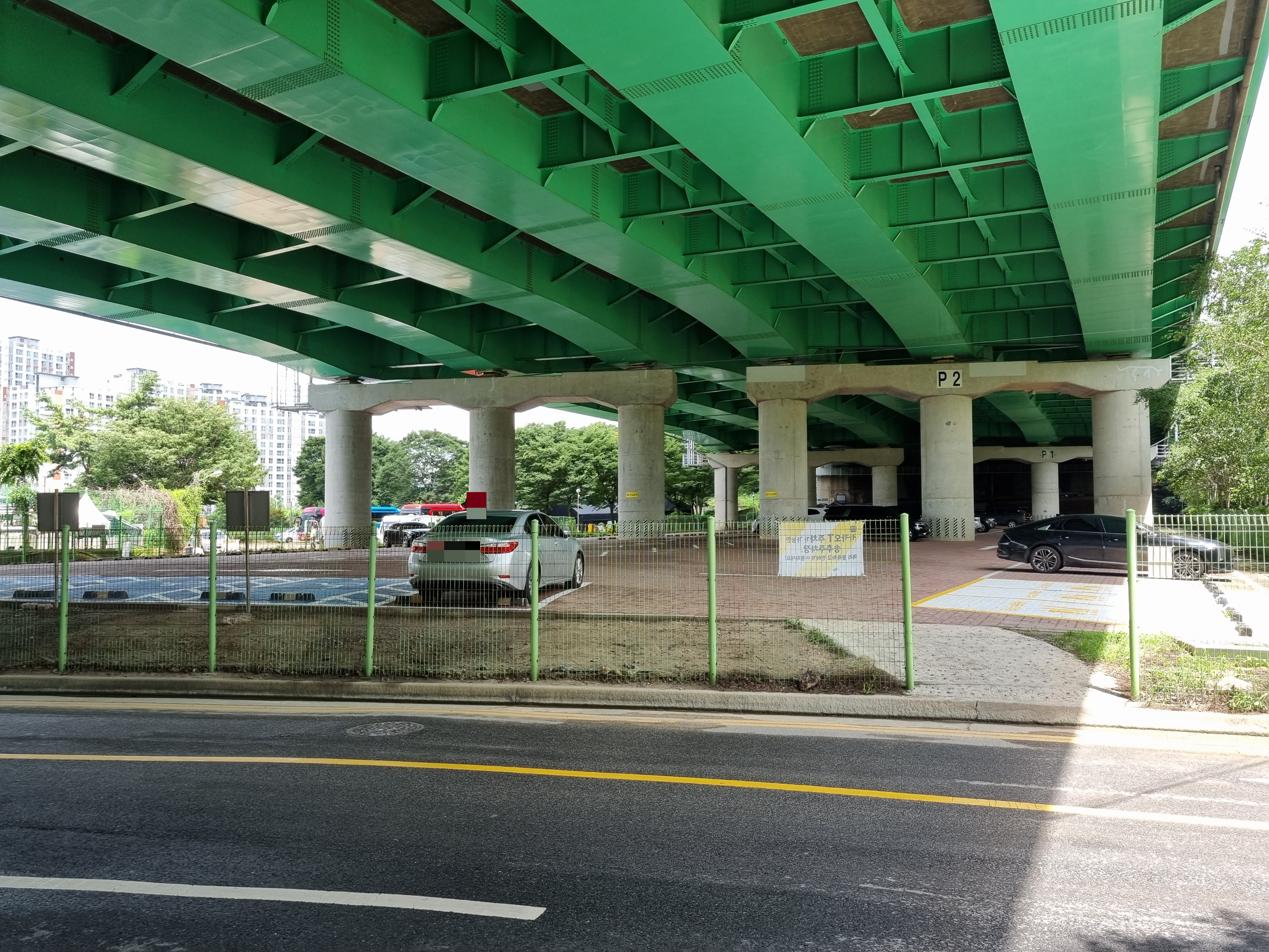 고가도로 아래 마련된 주차장은 송추제1주차장이에요. 주차 구역도 넉넉하고, 이쪽은 그늘이 많아 여름에도 차량 내부가 덜 뜨거워지는 장점이 있답니다. 하지만 계곡에서 가까운 주차장은 제2주차장이니 여기에 주차하는것을 추천드려요!