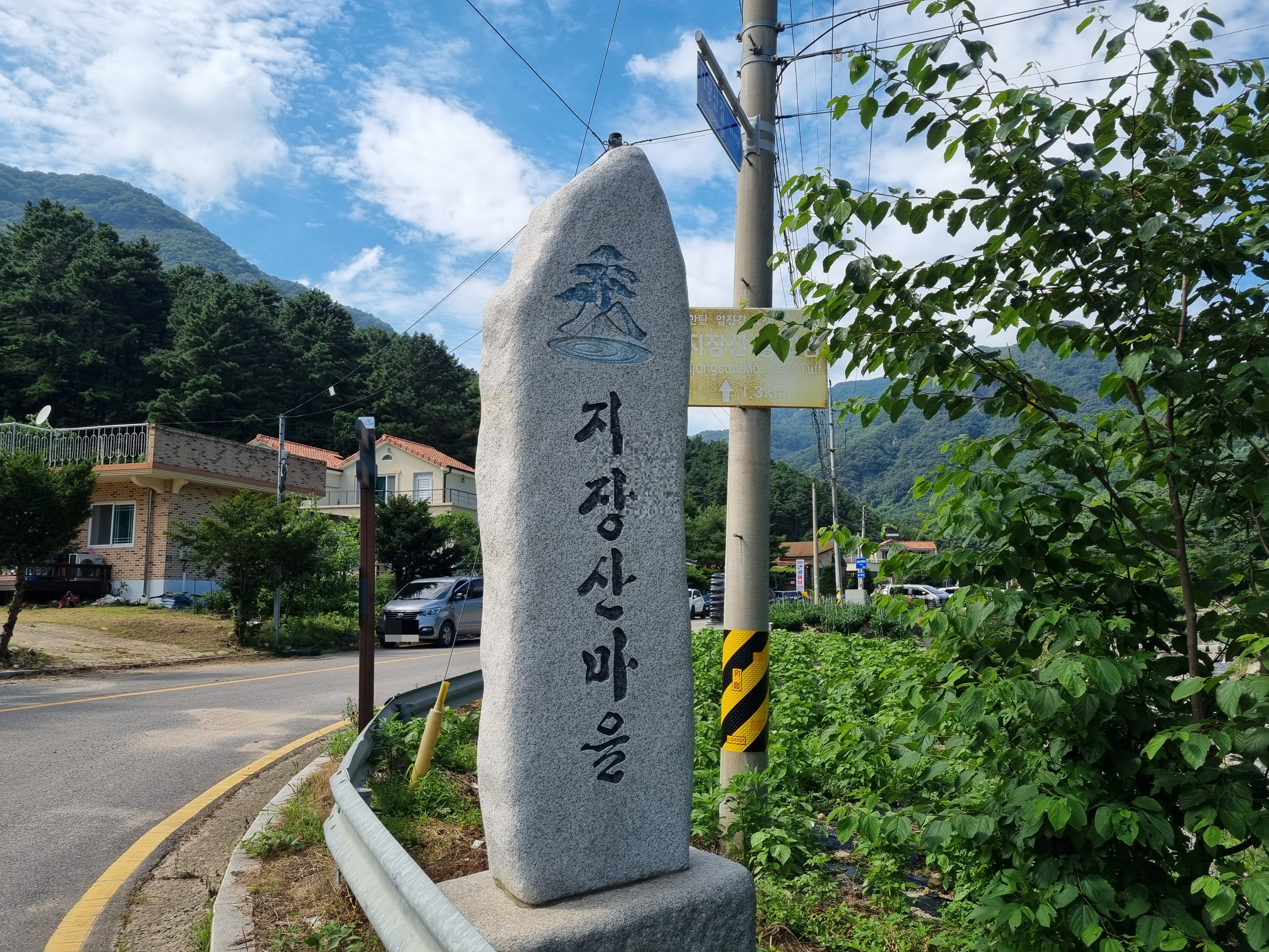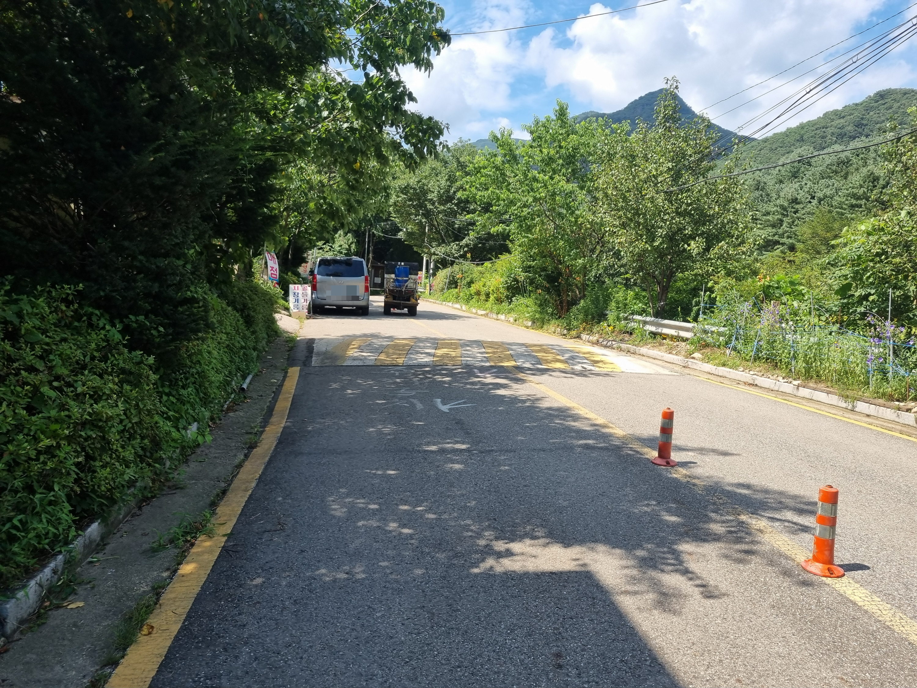 제1주차장 위로는 주차장이 없고, 도로 갓길에도 주차금지여서 주차장에 주차 후 걸어서 올라가야해요. 지장산계곡 입구로 향하는 길은 시골마을 느낌이 물씬 나는 아스팔트 도로였어요.