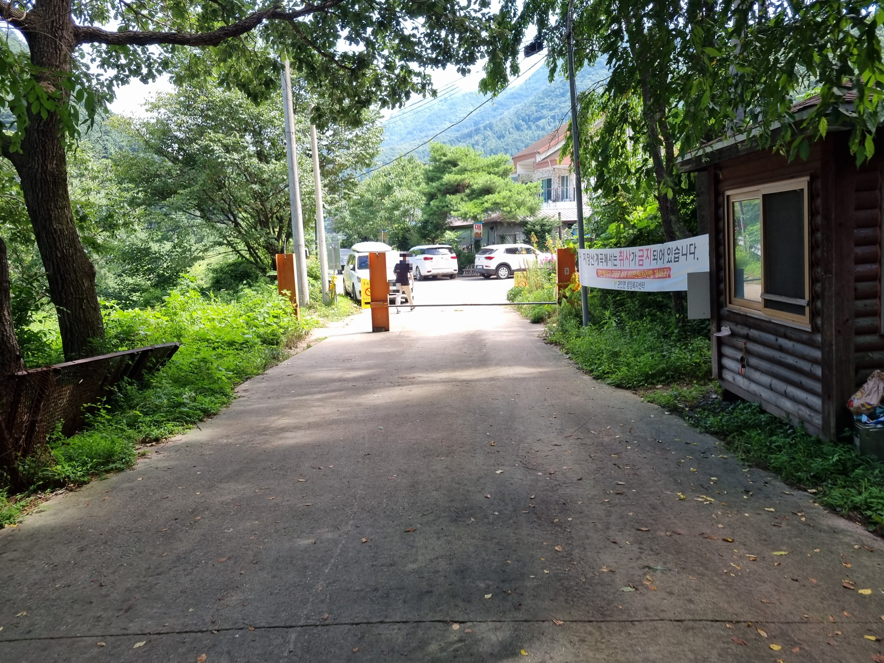 계곡 입구에는 차량진입을 막는 차단기가 설치되어있어서 일반차량은 이 위로 올라갈 수 없어요. 그 옆으로는 눈에 띄는 현수막이 하나 있었어요. ‘지장산계곡에서는 취사가 금지되어 있습니다’ 라고 크게 적혀 있었고, 위반 시 과태료가 부과된다고 안내되어 있어요. 포천시에서 공식적으로 금지한 만큼, 화기류나 취사 도구는 지참하지 않는 게 좋아요.