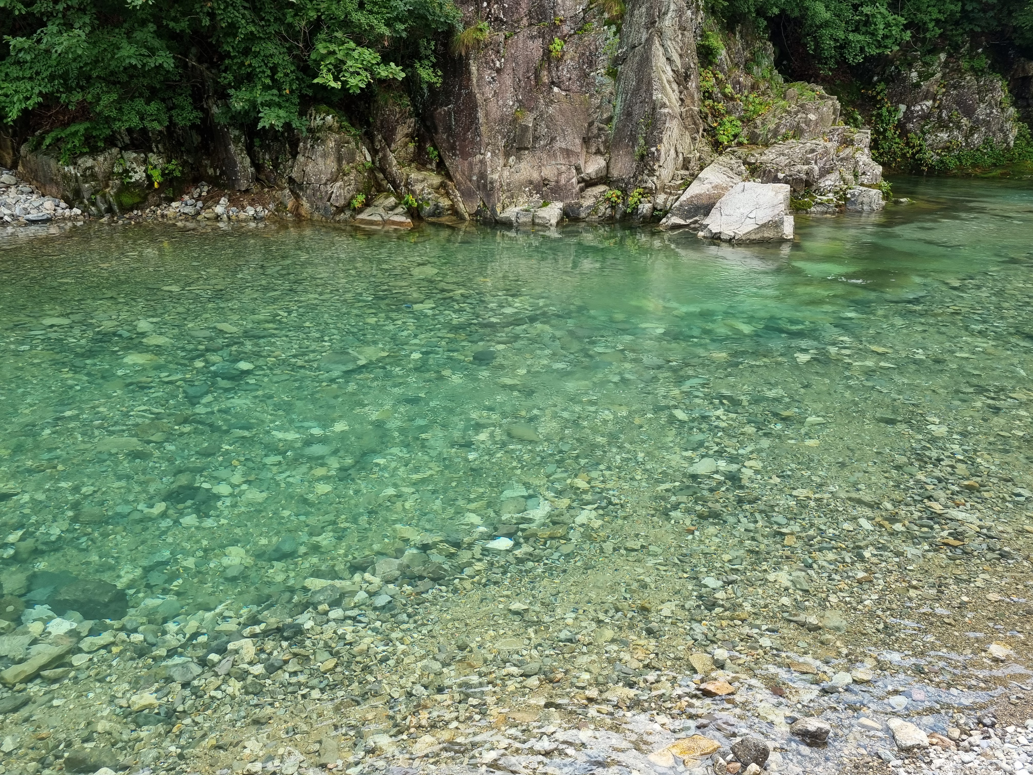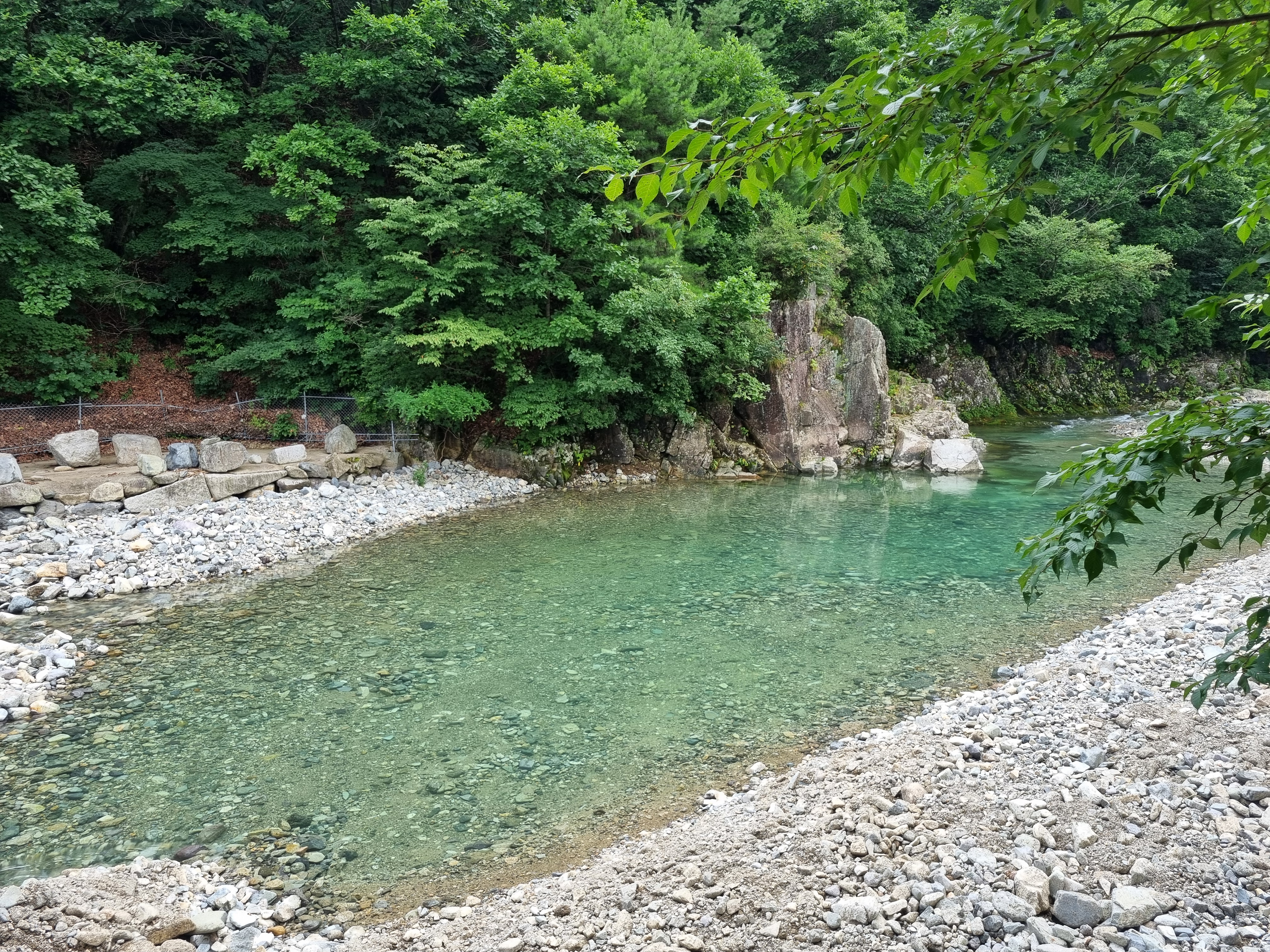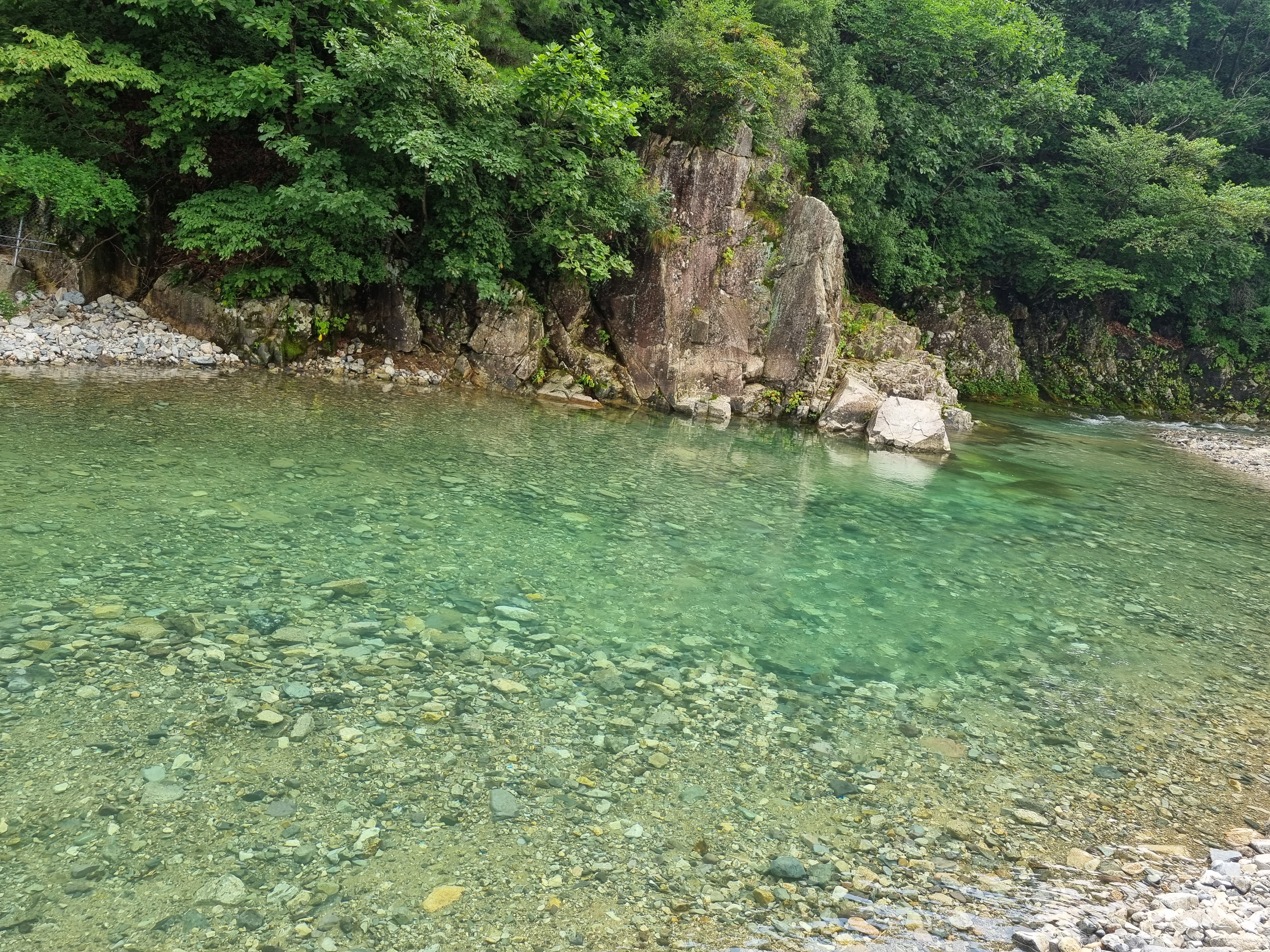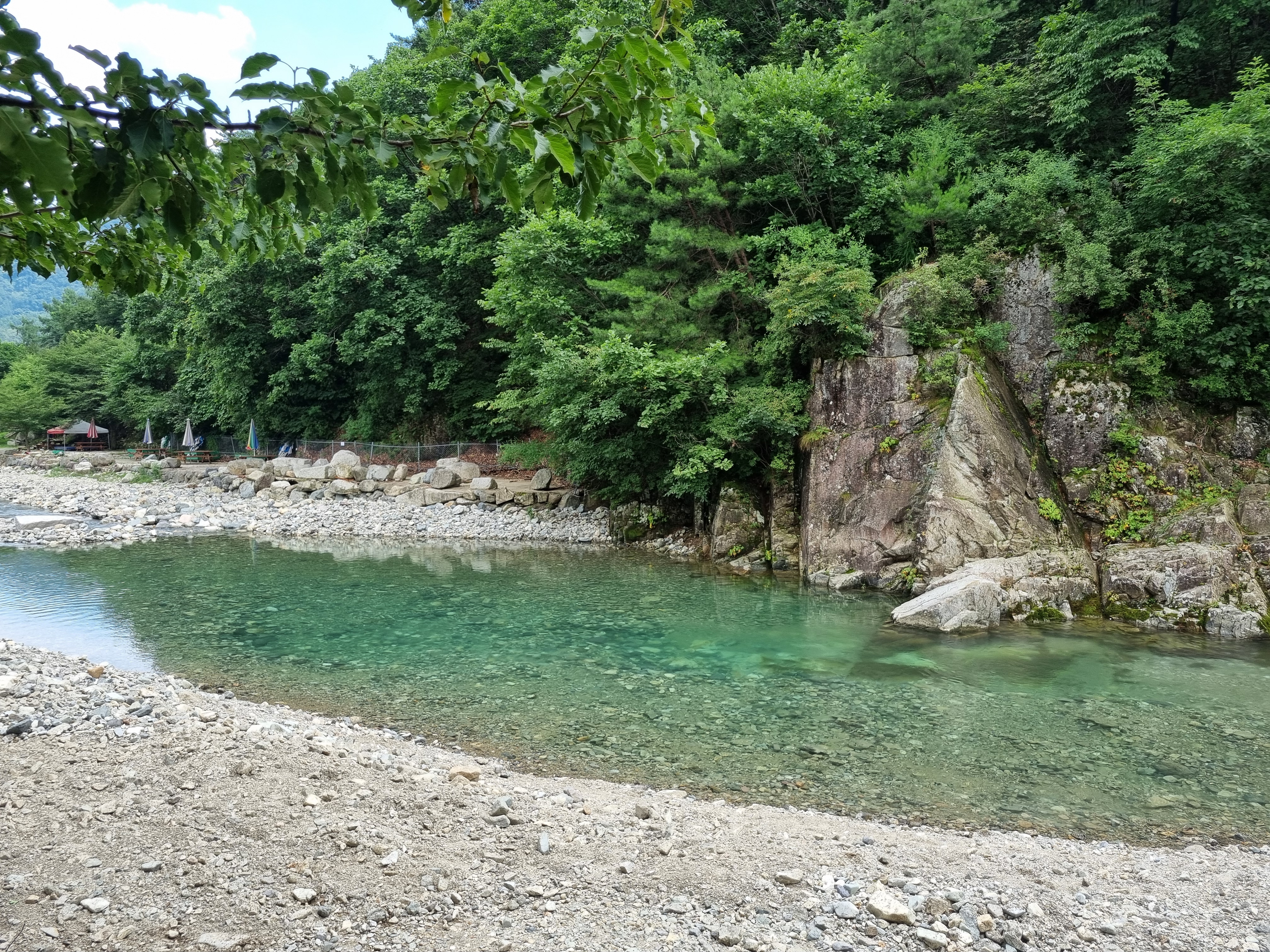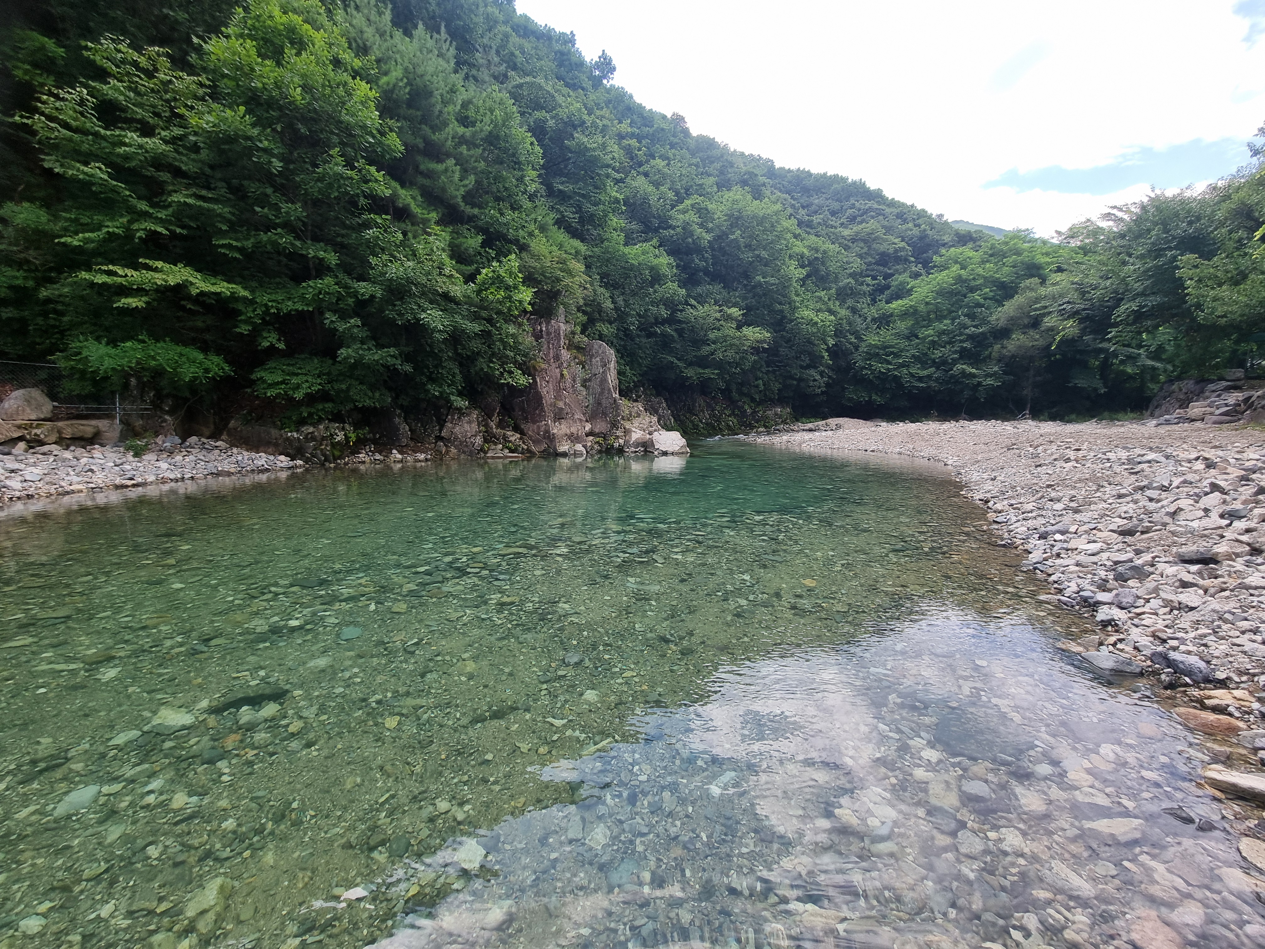 계곡이 전체적으로 완만하게 펼쳐져 있어 자리 잡기도 좋고, 얕은부분에서 점점 깊어지는 구조로 되어있어서 아이부터 어른까지 함께 즐기기 딱 좋은 구간이에요. 바닥은 전부 자갈과 모래로 되어 있어서 미끄럽지 않고, 발도 편안하더라고요. 양쪽으로 나무가 우거져 있어 자연 그늘도 충분하고, 뒤쪽으론 바위절벽이 병풍처럼 펼쳐져 한폭의 절경이었어요.