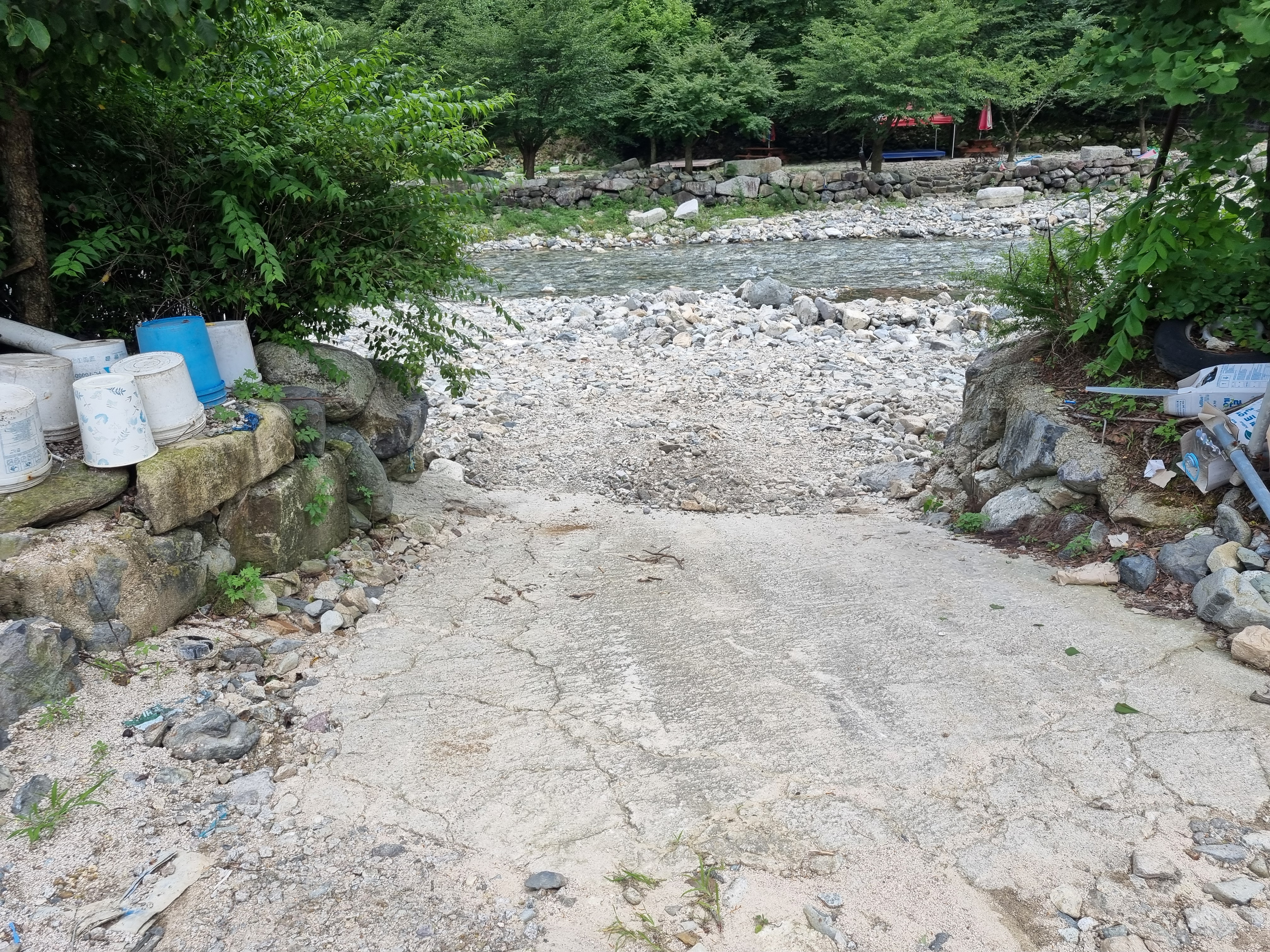 자! 이제 짐을 정리했으면 계곡으로 내려가볼 차례에요. 사진에 보이는 곳이 바로 종개비소 계곡으로 내려가는 진입로인데요. 돌길을 따라 내려가면 곧바로 시원한 계곡물이 반겨주고요. 계곡 진입 구간이 넓게 확보되어 있어 커다란 튜브를 들고 아이들과 함께 내려가기에도 충분해보여요.