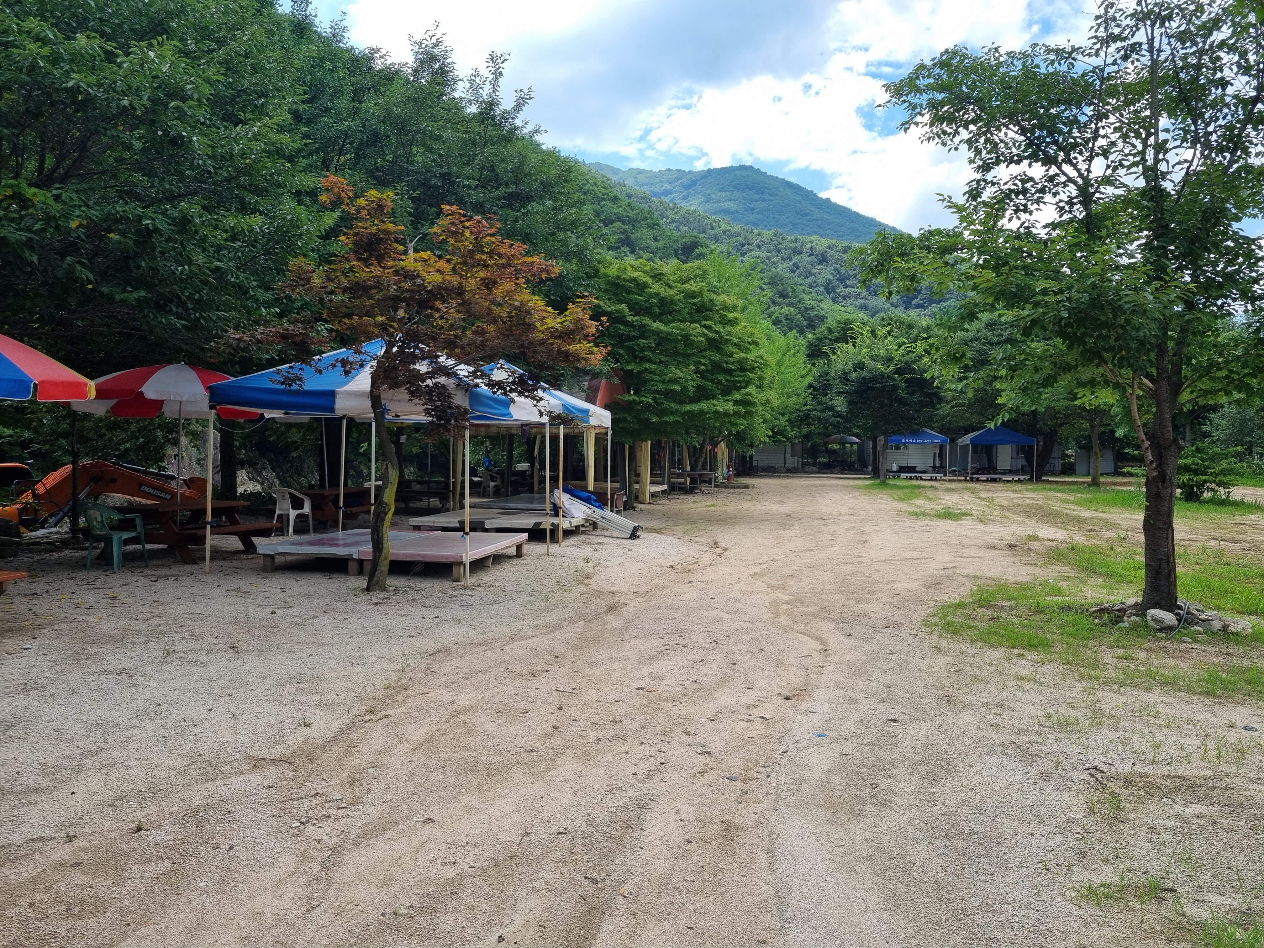 주차장에 들어서면 상당히 넓은 공터가 나와요. 주차장 한쪽에는 방갈로 즉, 평상이 설치되어있는데 차량을 바로 옆에 세워서 짐을 옮기기 편하답니다. 계곡과도 가까운 거리라 이동도 편리해서 물놀이하며 쉬기 딱 좋은 계곡피서지라는 생각이 들었어요.