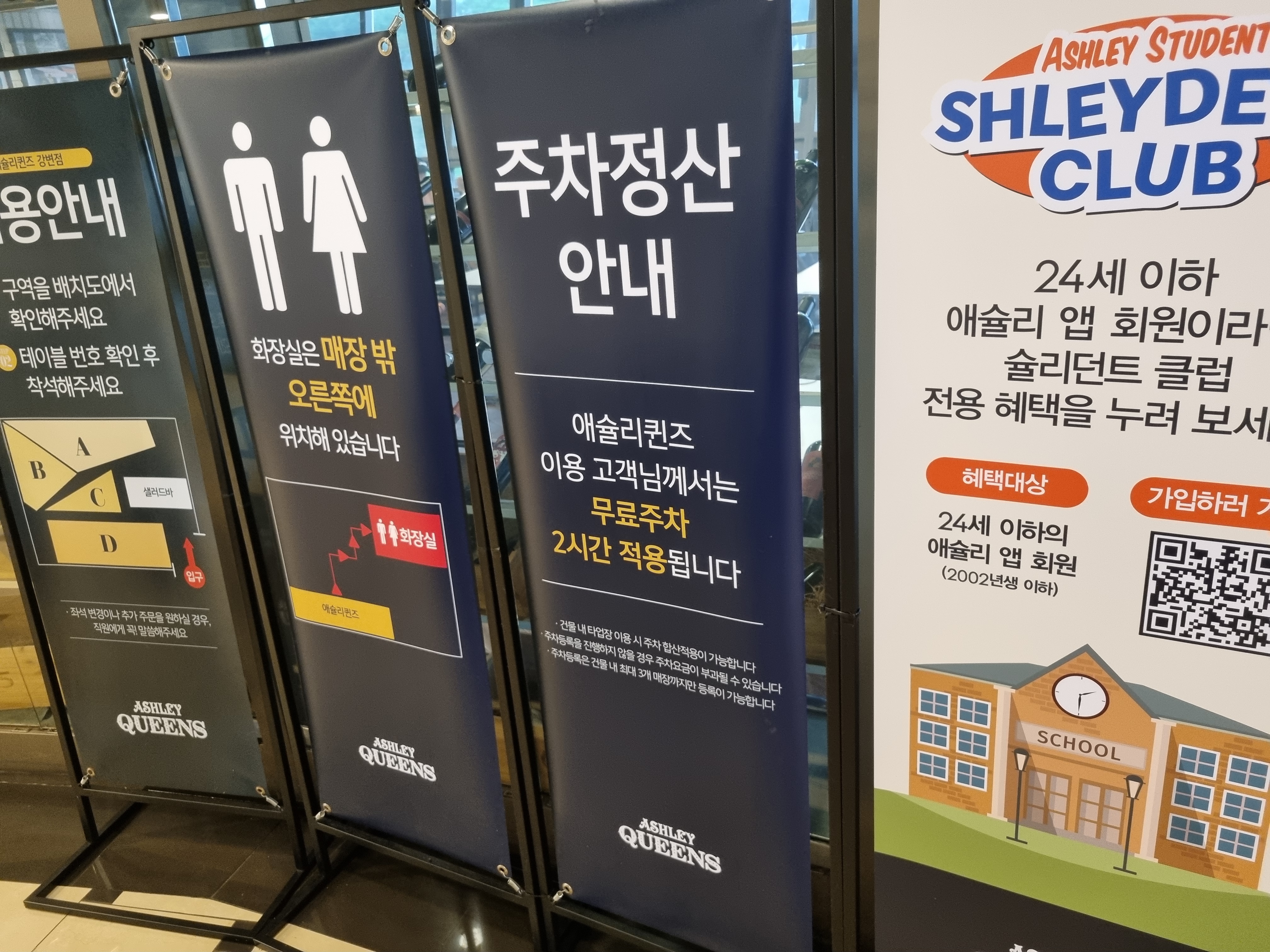 테크노마트 애슐리 주차장은 강변역 테크노마트 지하주차장을 이용하면 되는데요. 강변역 애슐리퀸즈 이용고객이라면 무료 주차 2시간 혜택을 받을 수 있어요. 화장실은 매장 밖 오른쪽에 위치해 있고, 24세 이하 애슐리 앱 회원은 ‘스튜던트 클럽’ 전용 혜택을 받을 수 있으니 참고하세요.