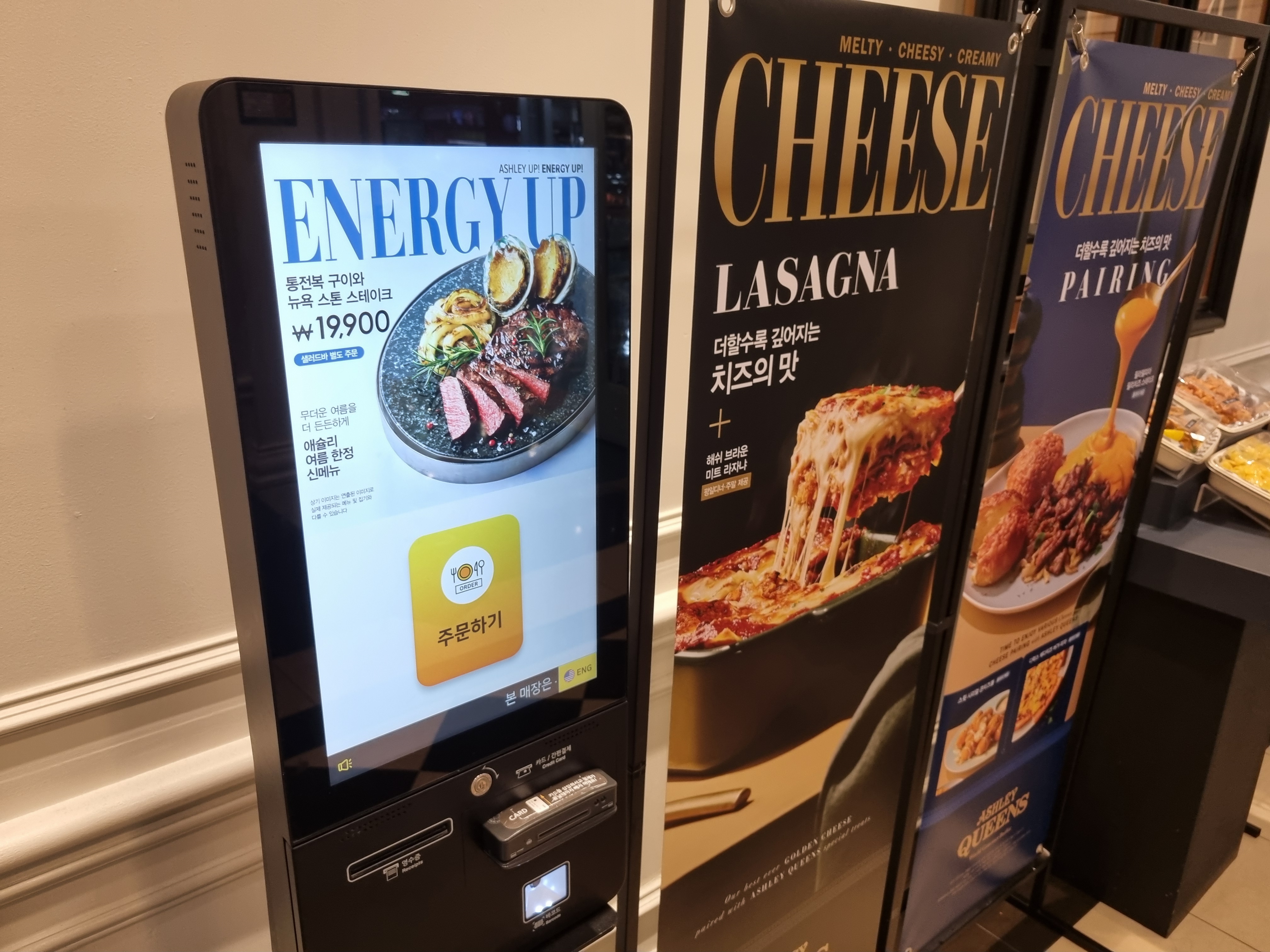 안쪽으로 들어가면 키오스크가 있어요. 원하는 메뉴나 옵션을 직접 선택해 주문할 수 있어 편리해요. 옆에는 시즌 한정 메뉴와 인기 메뉴를 소개하는 대형 포스터가 붙어있는데, 이날은 ‘치즈 라자냐’ 가 눈길을 끌었어요. 치즈를 듬뿍 올린 라자냐 사진이 식욕을 자극하고, 치즈 페어링 메뉴는 치킨과 함께 먹기 좋아 보여요.