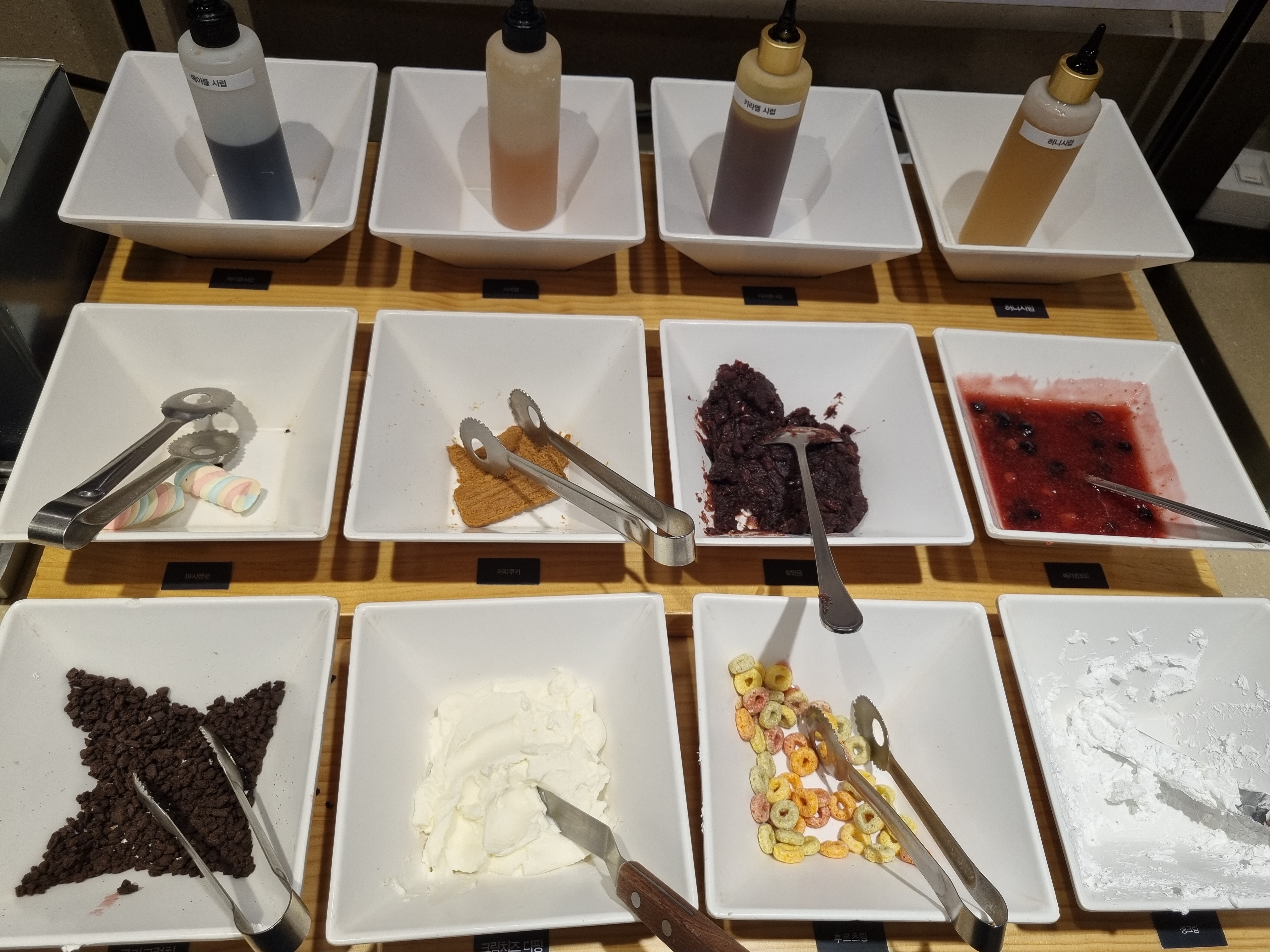 와플 기계 옆에는 초코칩, 시리얼, 마시멜로, 각종 시럽, 베리류 소스까지 토핑 바가 준비돼 있어요. 취향에 따라 조합해 나만의 디저트를 만들 수 있어 마무리로 즐기기 딱 좋아요.