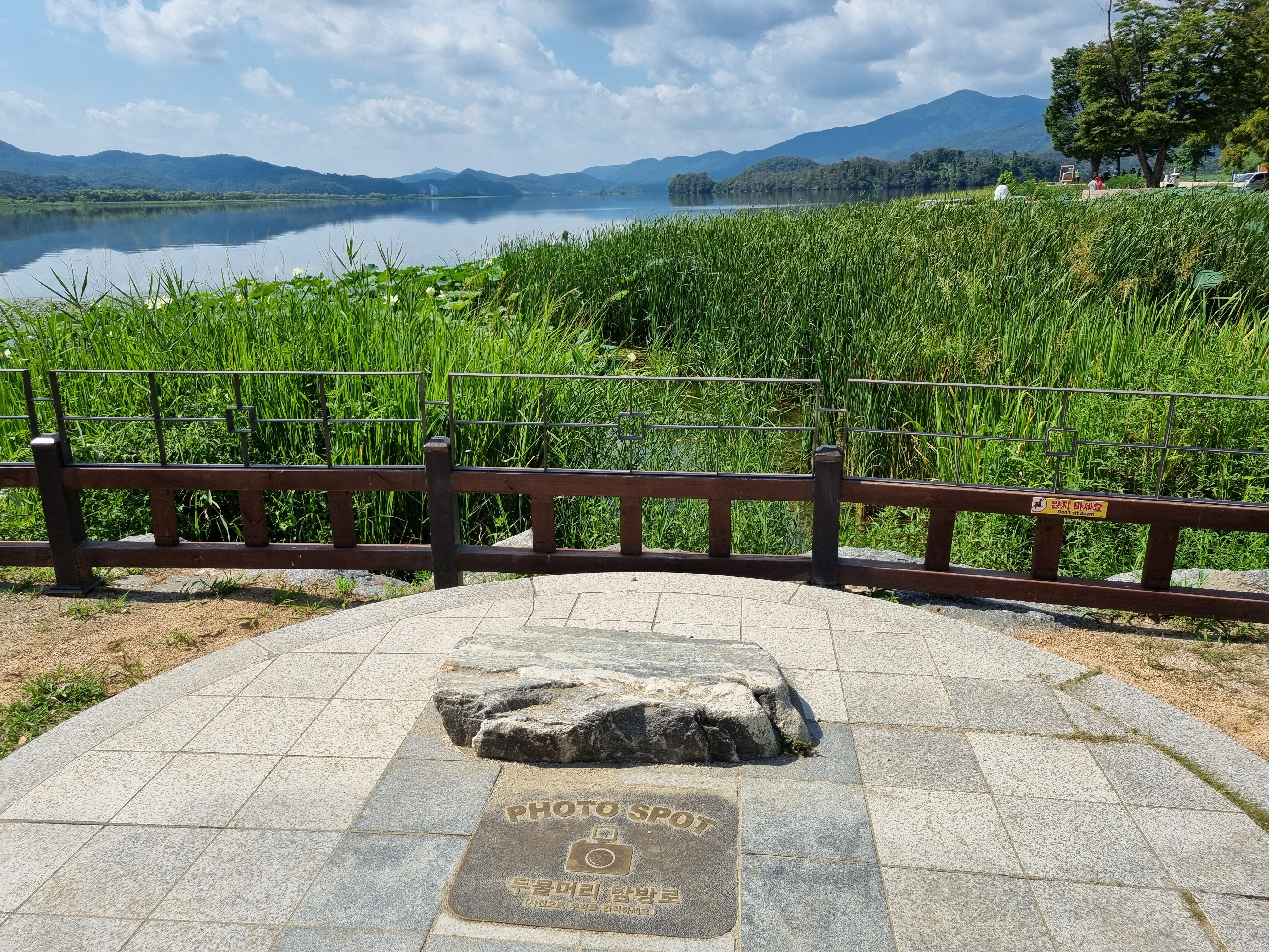 산책로를 따라 걷다 보면 ‘포토스팟’을 안내하는 표지석을 발견할 수 있어요. 바닥에 표시된 자리에 서서 사진을 찍으면 강과 산, 그리고 연밭이 함께 담겨 멋진 배경이 되지요. 관광객들이 발길을 멈추고 인증샷을 남기는 명소답게 늘 사람들이 북적이지만, 잠시 기다리면 충분히 나만의 사진을 남길 수 있답니다. 두물머리를 찾는다면 이곳에서의 기념 촬영은 빠질 수 없는 즐거움이에요.
