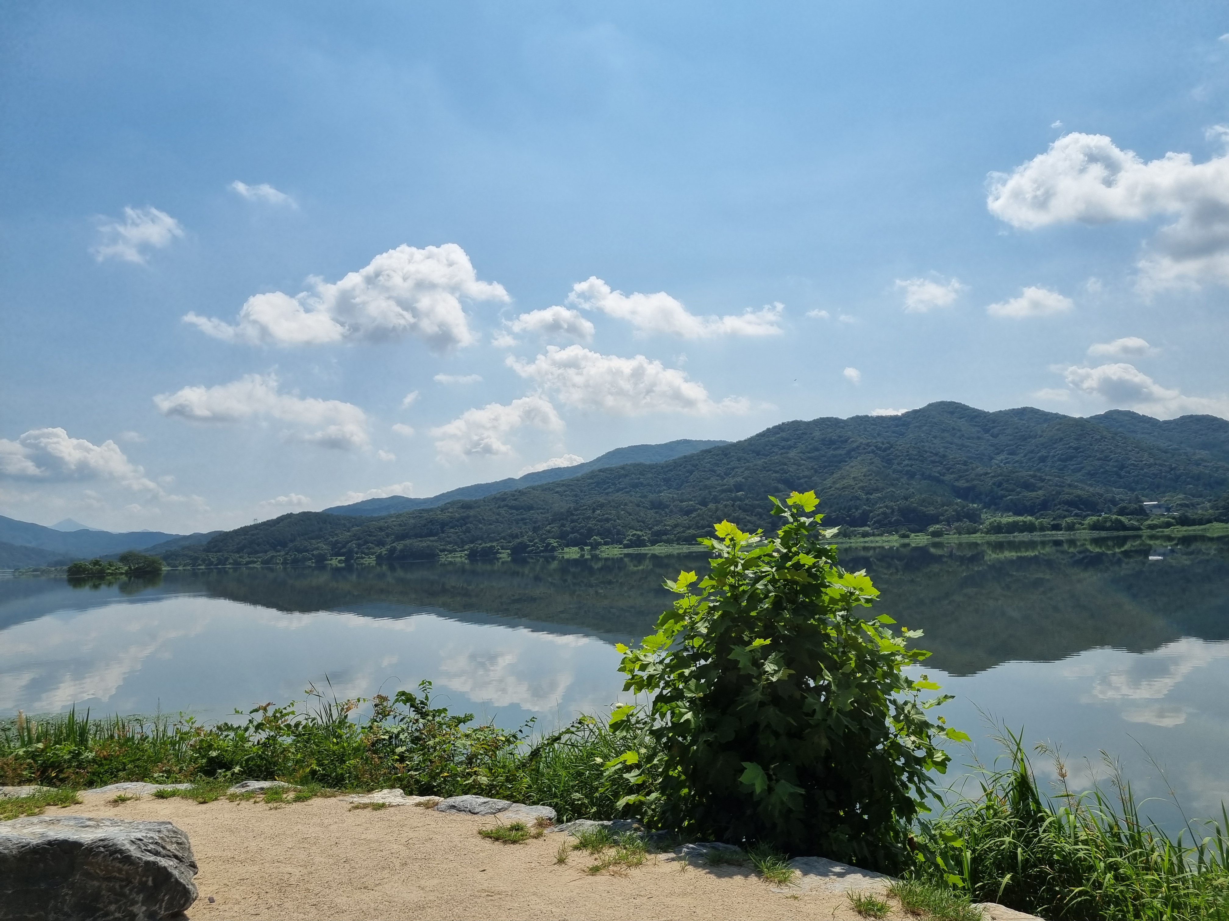 눈앞에 펼쳐진 북한강은 잔잔하게 흐르고 있었고, 그 물결 위로 구름과 산이 그대로 비치고 있었어요. 강가에 자라난 작은 나무 한 그루가 이 풍경의 중심처럼 서 있었는데, 덕분에 사진 속 장면이 더 특별하게 다가왔습니다. 강의 고요함과 나무의 생동감이 묘하게 대비되면서도 조화를 이루는 모습이 인상적이었어요.