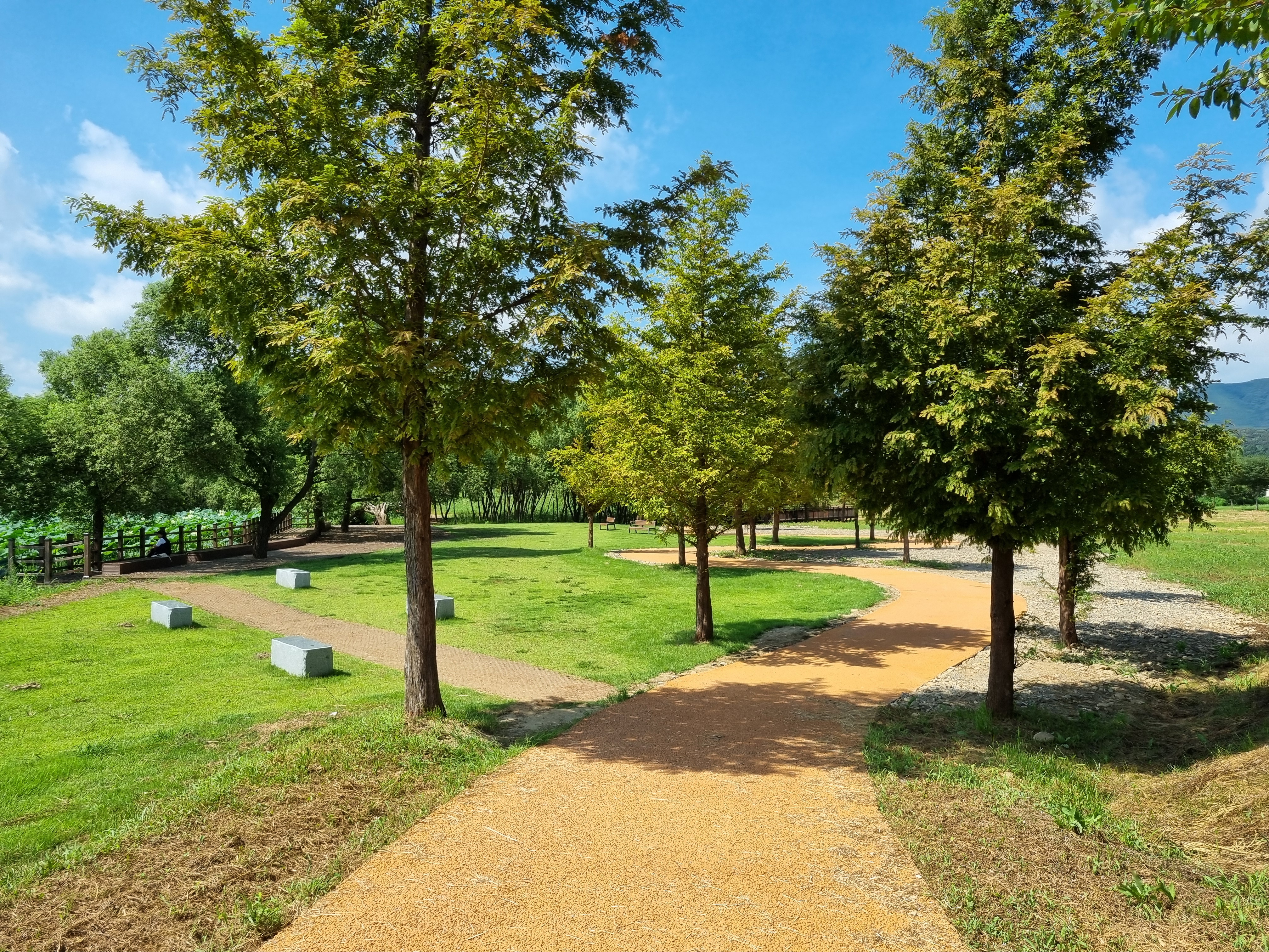 산책길은 잘 정돈되어 있어 걷기 편했어요. 양옆으로 나무들이 늘어서 있어 그늘을 만들어주었고, 곳곳에서 연밭과 숲의 풍경이 어우러져 산책 내내 지루할 틈이 없었답니다. 강변을 따라 이어지는 길은 계절마다 다른 풍경을 보여준다고 하는데, 여름의 초록빛이 주는 활력은 무엇보다도 특별했어요. 발걸음을 옮길수록 자연과 가까워지는 느낌을 받을 수 있었습니다.