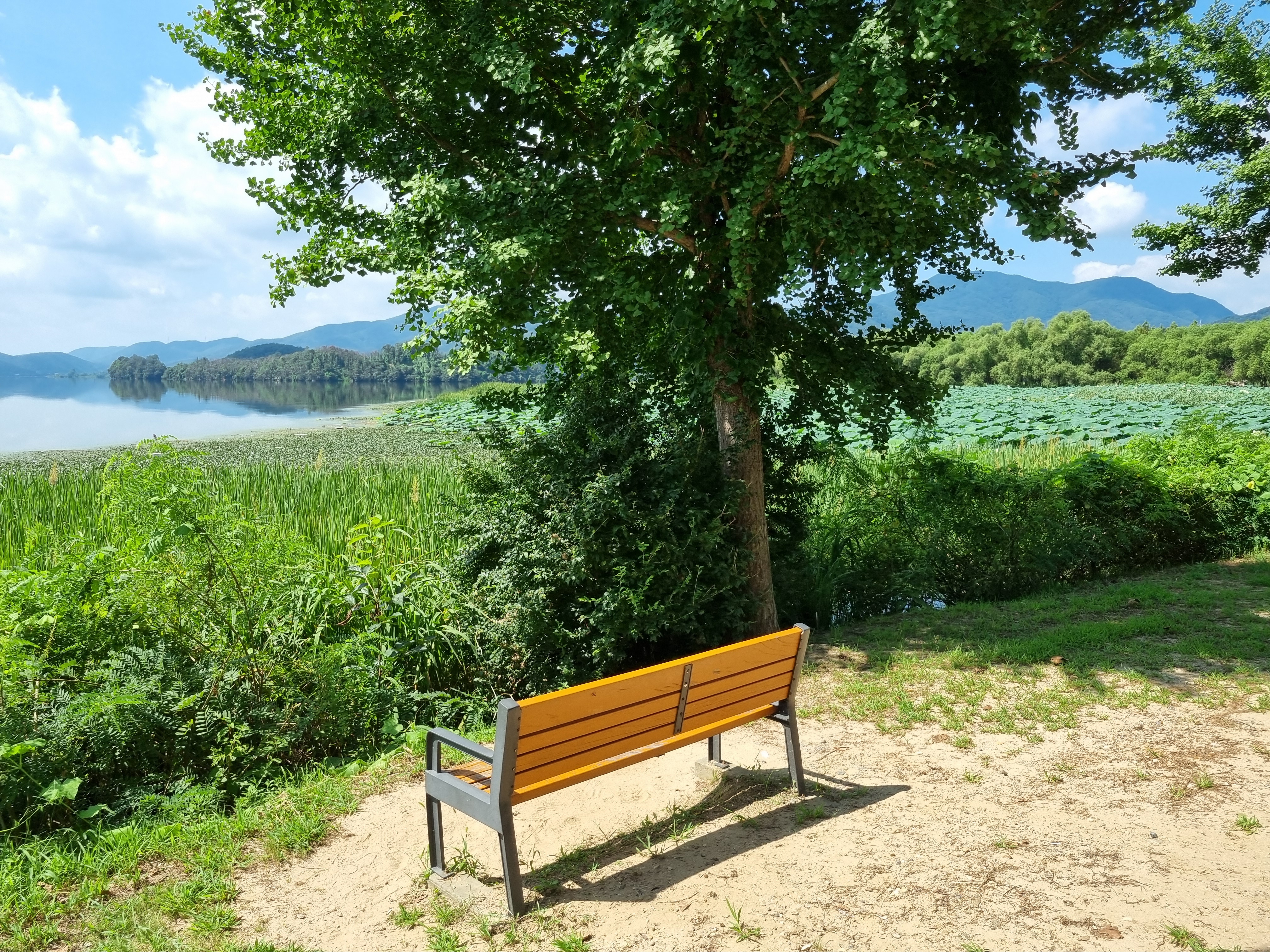 산책로를 걷다 보면 연밭이 보이는 곳곳에 벤치가 놓여 있는데, 특히 나무 그늘 아래 벤치는 여름철 최고의 쉼터였어요. 바람에 흔들리는 나뭇잎 소리와 새소리가 어우러져 그 자체로 힐링이 되었고, 연잎이 가득한 풍경은 계절의 싱그러움을 더해주었습니다. 강바람이 불어와 땀을 식혀주니 잠시 앉아 쉬어가기에 딱 좋았어요. 조용히 머물며 자연과 함께하는 시간이 참 소중하게 느껴졌습니다.