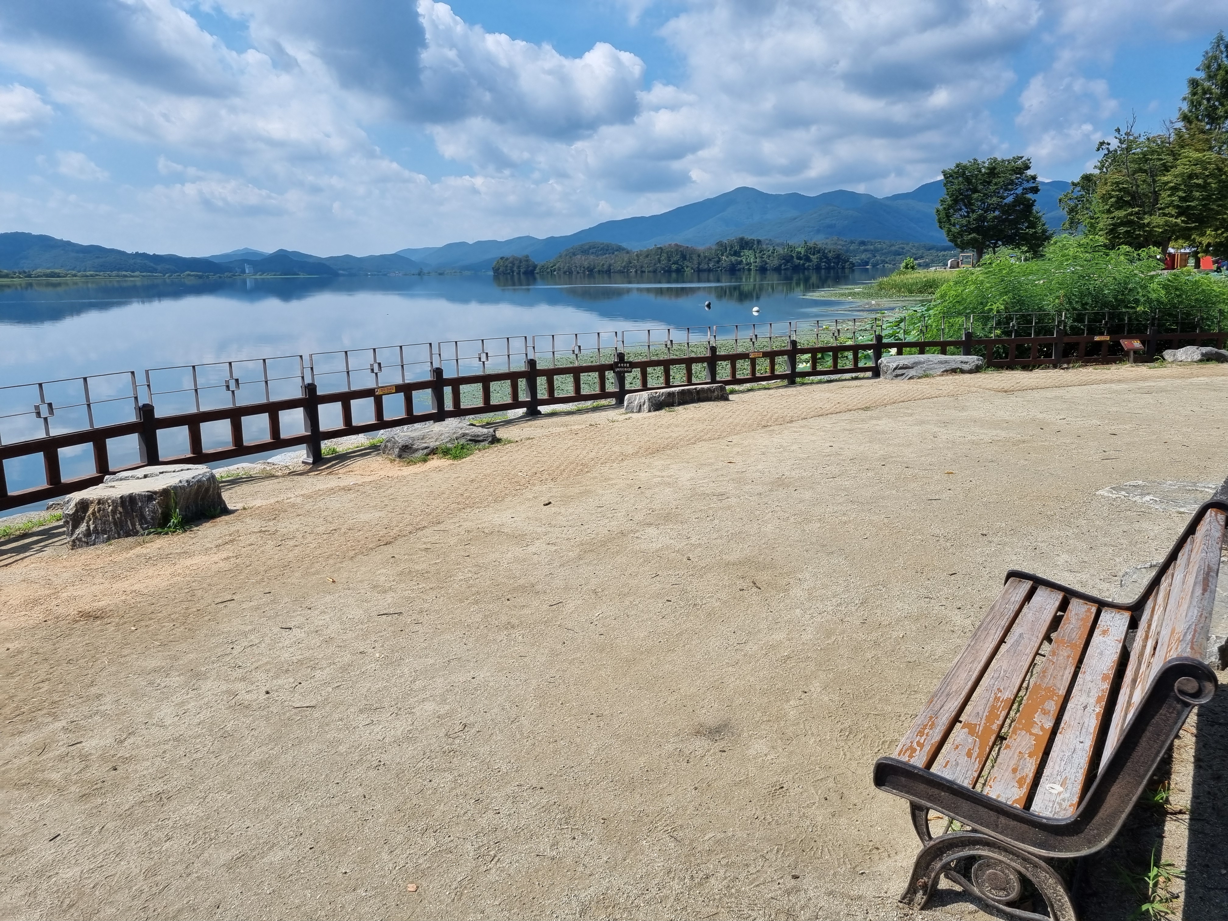 강변에는 곳곳에 벤치가 마련되어 있어 잠시 앉아 풍경을 감상하기 참 좋았어요. 눈앞으로 펼쳐지는 북한강의 넓은 물길은 마음을 시원하게 트이게 만들었고, 강 위에 비친 산자락과 흰 구름이 조화를 이루어 한눈에 담기 어려울 정도로 아름다웠습니다. 벤치에 앉아 강바람을 맞다 보면 일상의 복잡함이 사라지고, 오직 여유와 휴식만이 머무는 듯한 기분이었어요. 여행 중 잠시 멈춰 서서 사색하기 좋은 장소였답니다.
