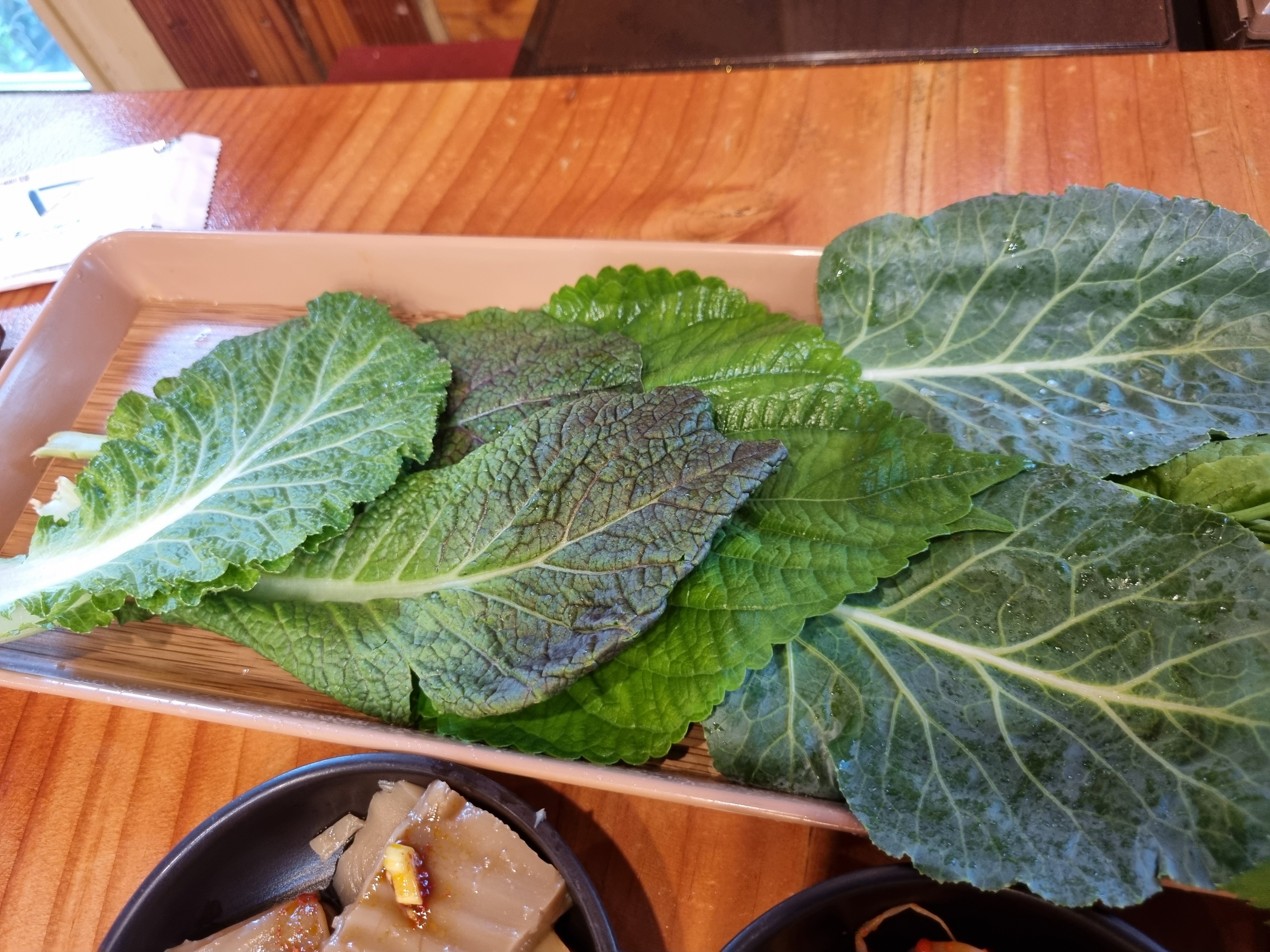 아삭하면서도 담백해 매콤한 제육과 잘 어울리고, 깻잎은 향긋한 풍미로 고기의 느끼함을 잡아줘요. 채소들이 크고 푸짐하게 제공돼서 두툼하게 싸 먹을 수 있는 점이 만족스러웠어요.