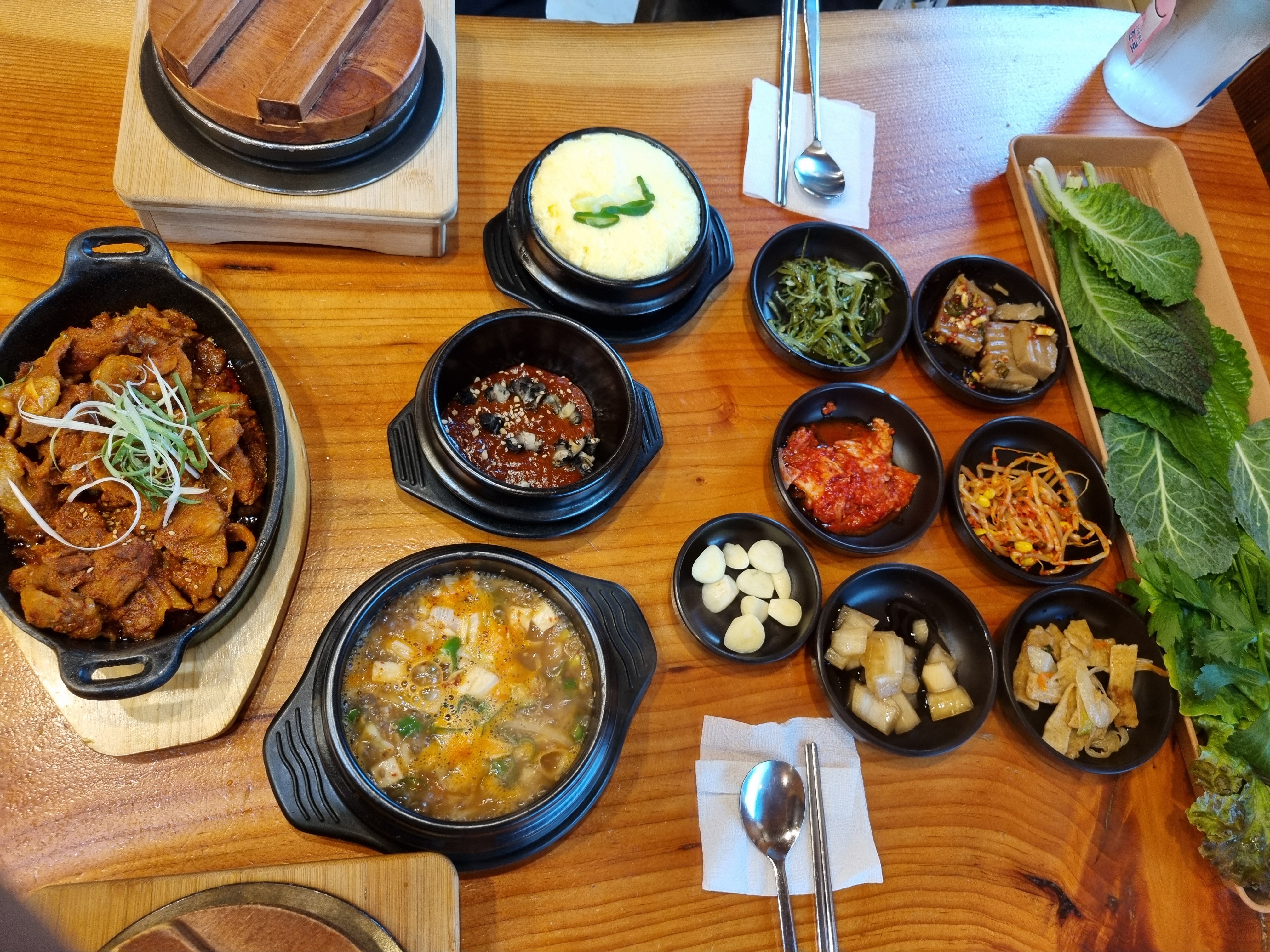 쌈밥을 주문하면 다양한 밑반찬이 함께 나와 상이 꽉 차요. 각종 나물, 김치, 마늘, 쌈 채소가 풍성하게 나오고, 된장찌개와 계란찜까지 곁들여져 한 끼가 매우 만족스러워요. 무엇보다 채소가 신선해 고기의 맛을 잘 살려줘서 밸런스가 좋아요.