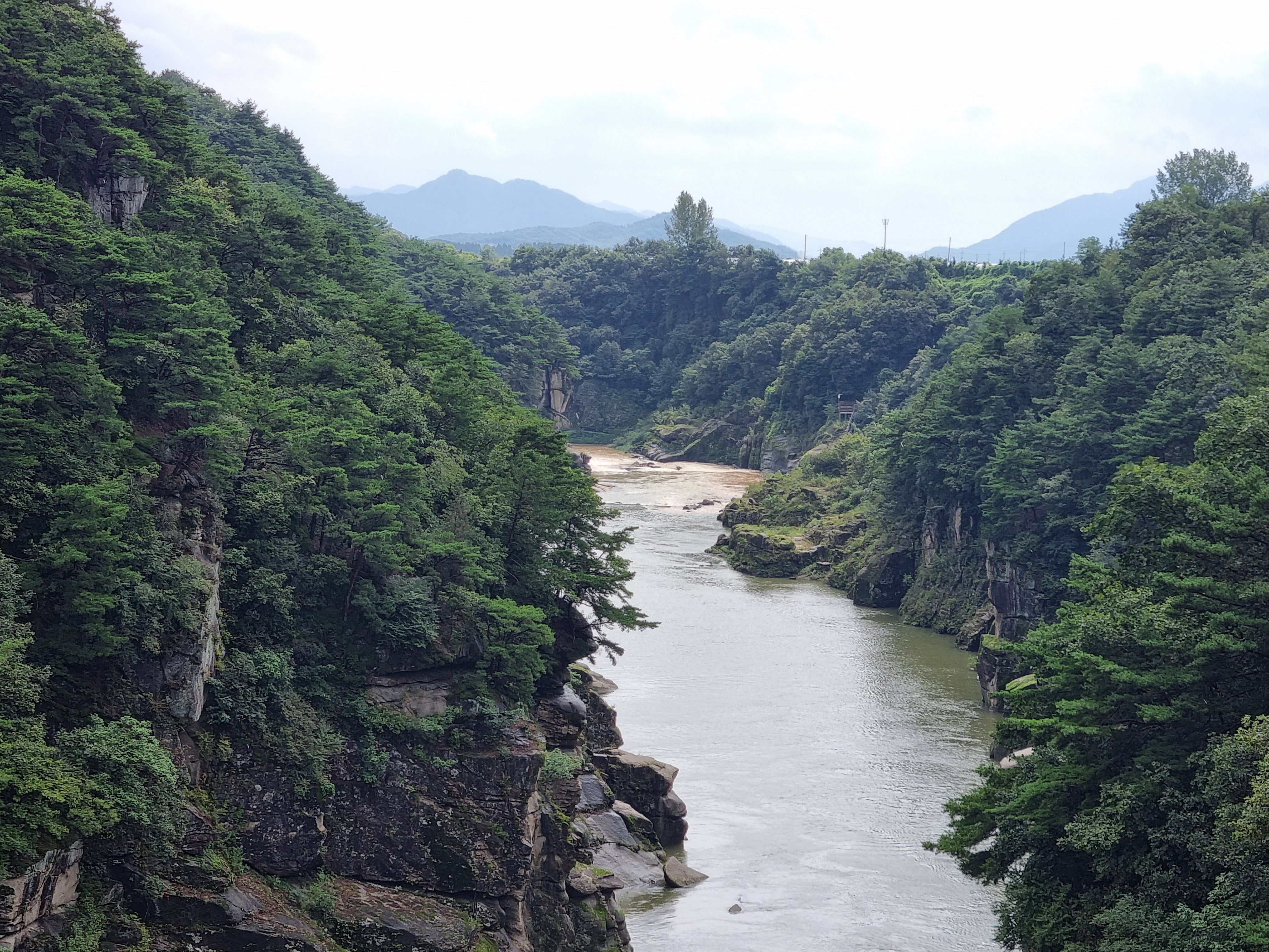 멀리서 바라본 한탄강 협곡의 모습이에요. 양쪽 절벽 사이로 흐르는 강물은 마치 세월의 흐름을 그대로 담고 있는 듯해요. 멀리 산맥까지 어우러져 한층 더 웅장함을 느낄 수 있어요.