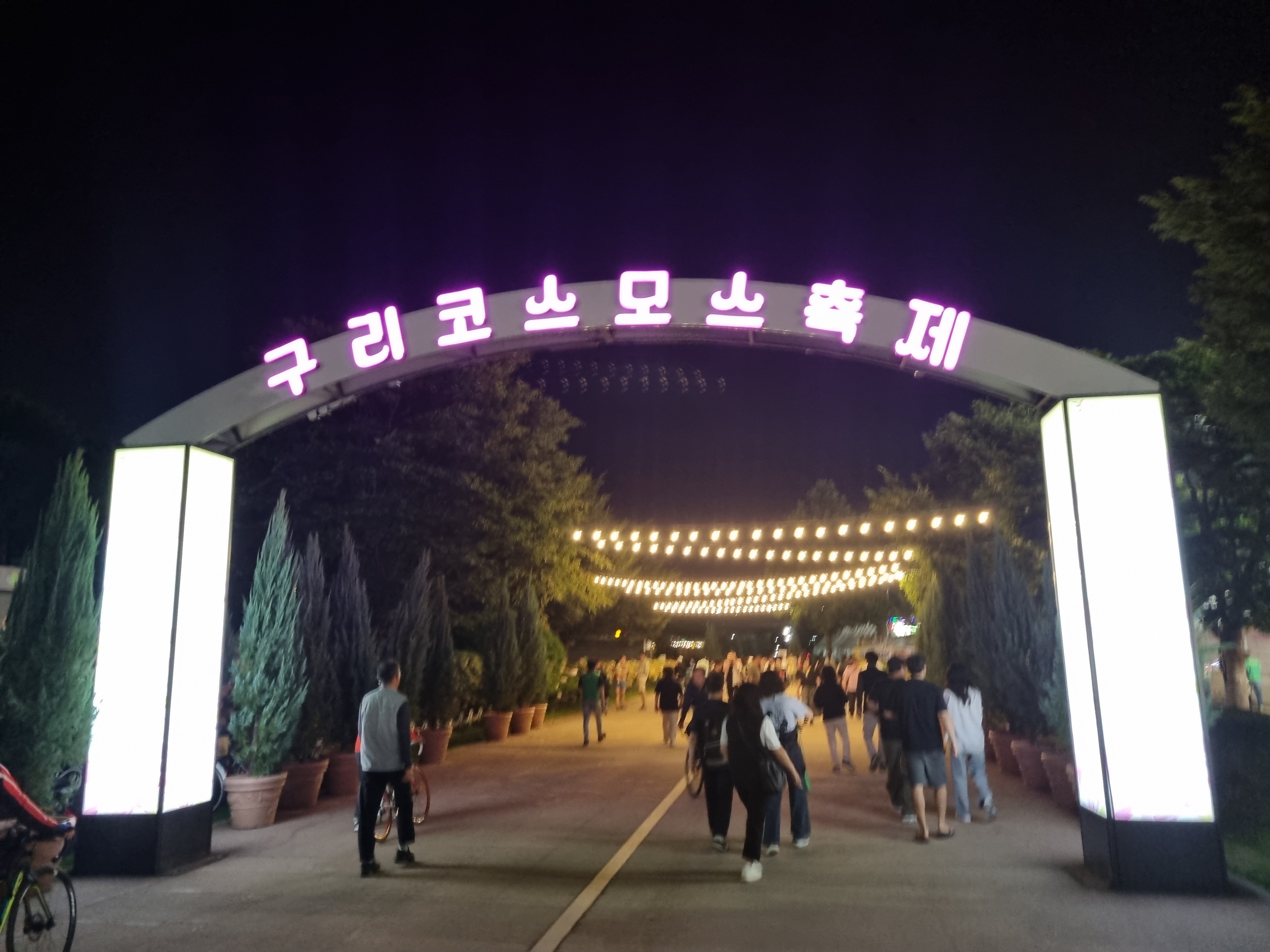 구리 코스모스 축제 입구에는 커다란 아치형 게이트가 반짝이는 보랏빛 조명으로 빛나고 있어요. 입구부터 많은 사람들이 모여 활기찬 분위기가 느껴지고, 게이트 안쪽으로 이어진 불빛 가득한 길이 축제의 설렘을 더해줘요. 밤에도 환하게 빛나는 조명이 축제의 시작을 알리는 듯해 발걸음이 자연스레 빨라졌어요.