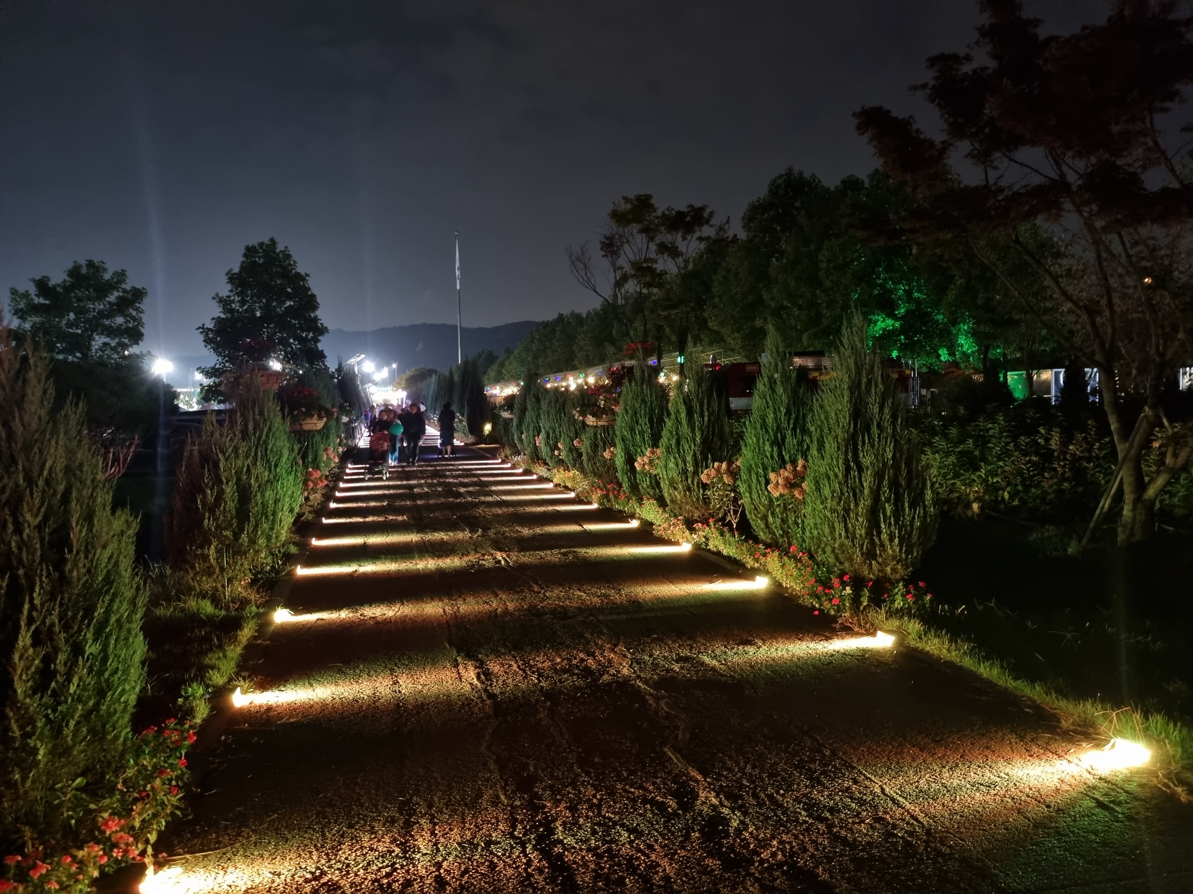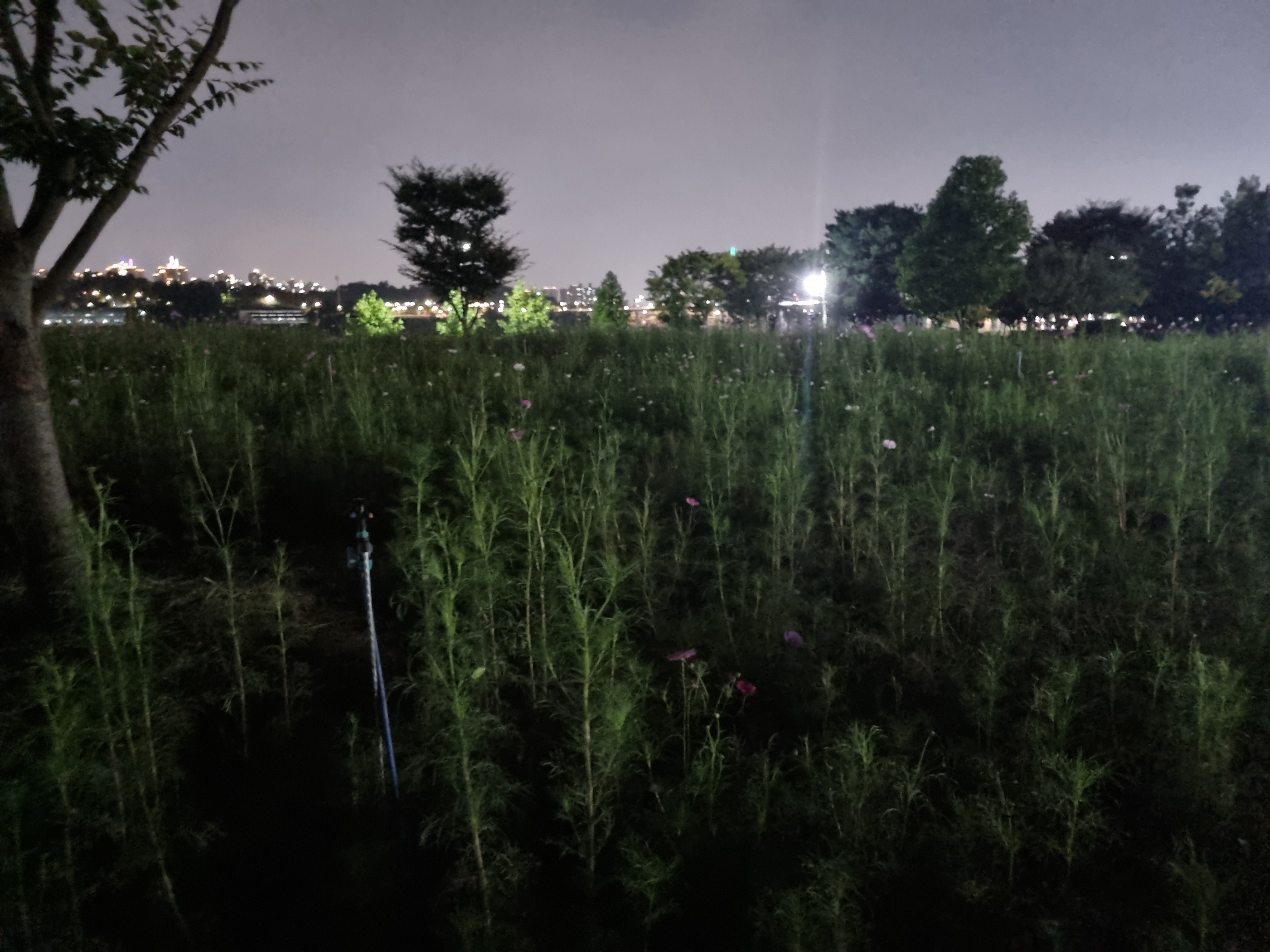 어두운 밤에도 코스모스 밭이 펼쳐져 있어요. 조명 아래에서 코스모스가 살짝 보이는데, 낮에 보면 더 화려하겠지만 밤에는 은은한 실루엣이 낭만적인 분위기를 만들어줘요. 바람에 흔들리는 코스모스를 보니 가을이 온 걸 실감하게 돼요.