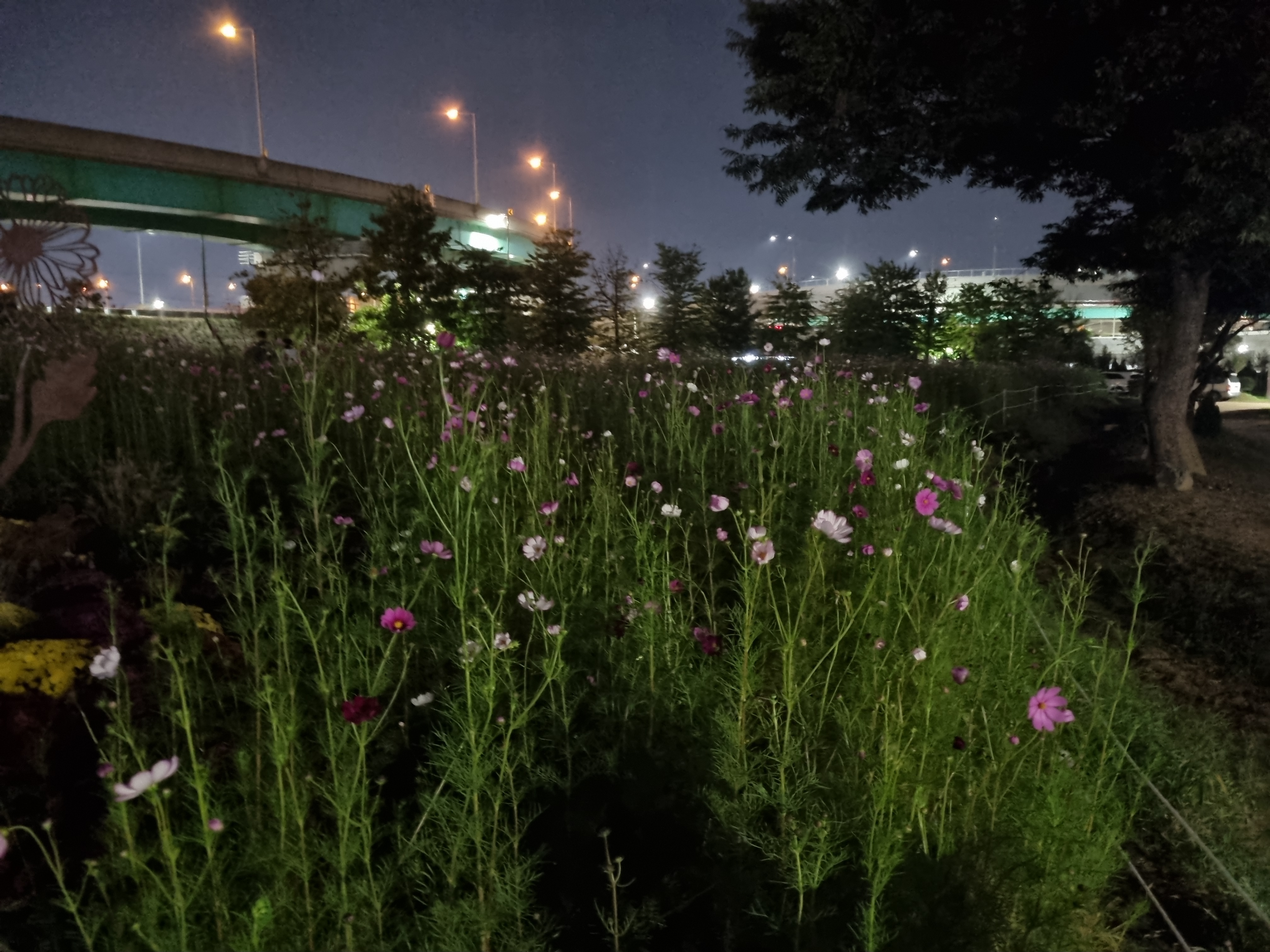 가까이 다가가면 코스모스의 색감이 조금 더 뚜렷하게 보여요. 보랏빛, 분홍빛이 어우러져 밤에도 아름다움을 뽐내고 있어요. 코스모스가 한창 피기 시작하는 시기라 앞으로가 더 기대돼요.