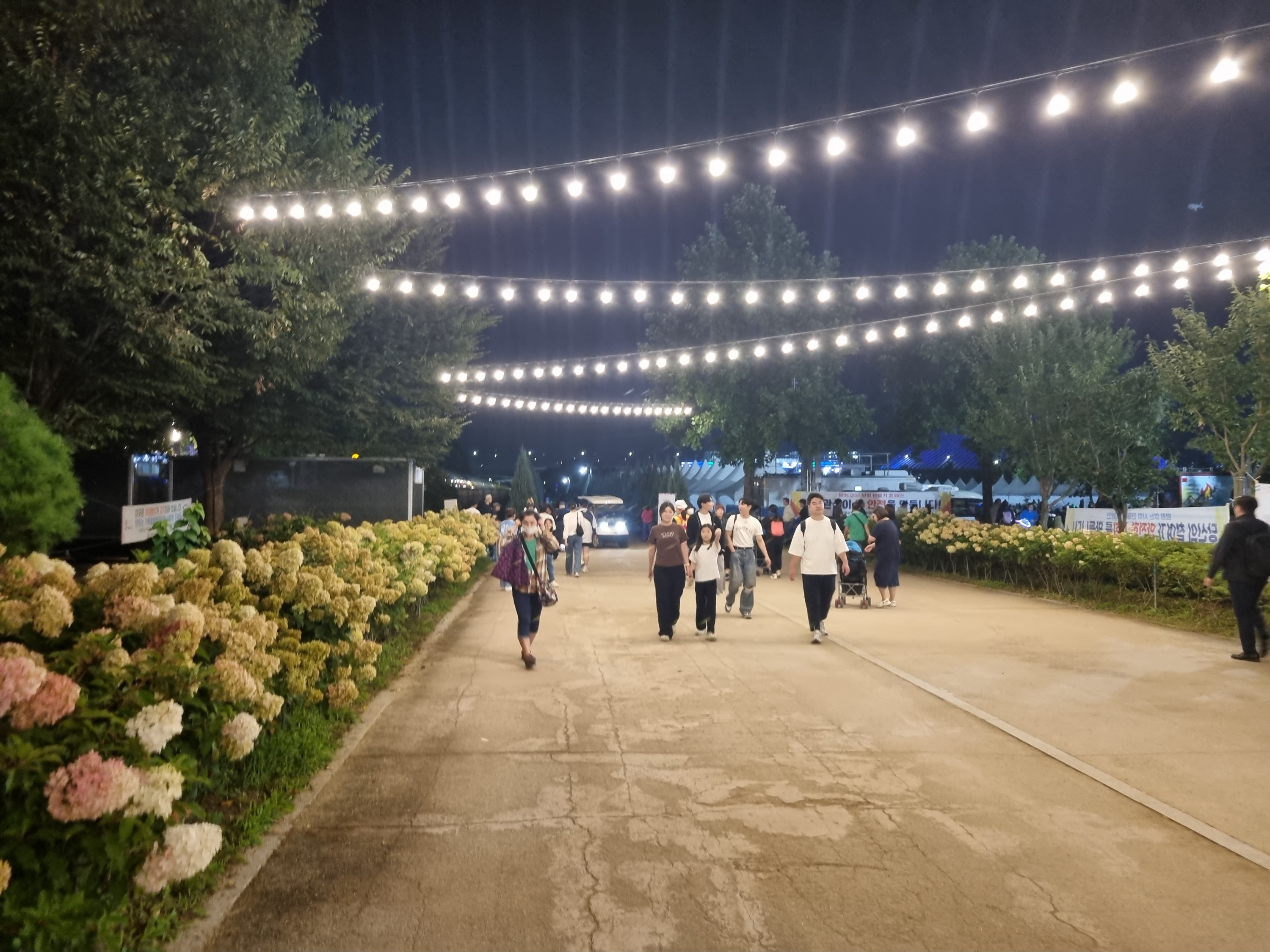 길 한편에는 수국이 줄지어 피어 있어요. 은은하게 빛나는 조명 아래에서 꽃들이 더욱 화사하게 보여요. 꽃 옆에는 안내 배너와 다양한 부스가 있어 구경거리가 많고, 산책하며 사진 찍기에도 좋은 장소예요.