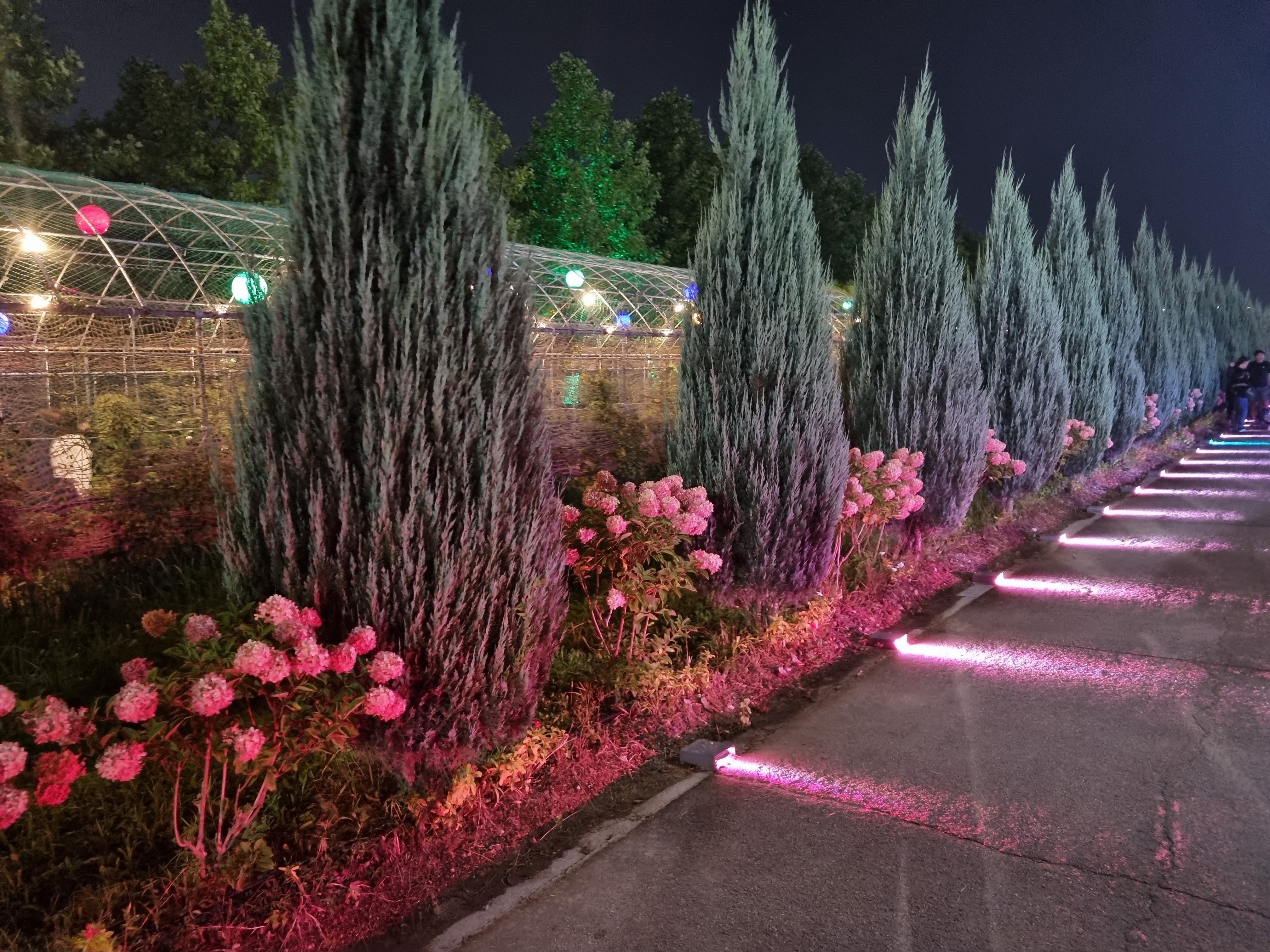 분홍빛 조명 아래 꽃들이 화사하게 빛나고 있어요. 다양한 색의 조명이 설치되어 있어 밤에만 느낄 수 있는 특별한 분위기를 선사해요. 낮과는 확연히 다른 매력이 있어요.