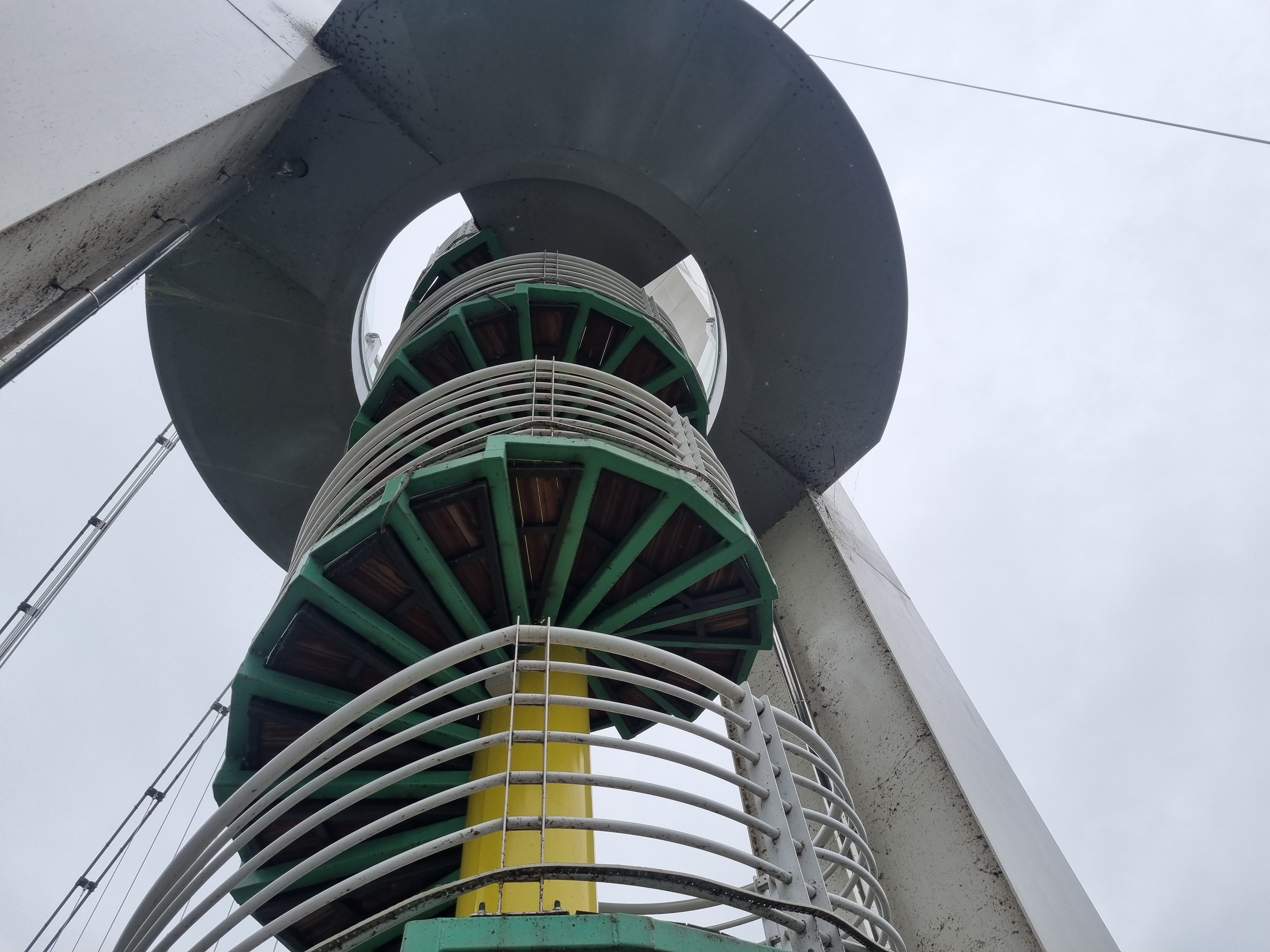 탑 안쪽에는 이렇게 나무로 된 나선형 계단이 이어져 있어요. 철제 프레임에 녹색과 노란색이 포인트로 들어가 있어서 색감이 독특했어요. 빗방울이 조금 떨어지는 날이라 조심히 걸었는데, 계단을 따라 내려오며 보는 풍경도 꽤 운치 있었어요.
