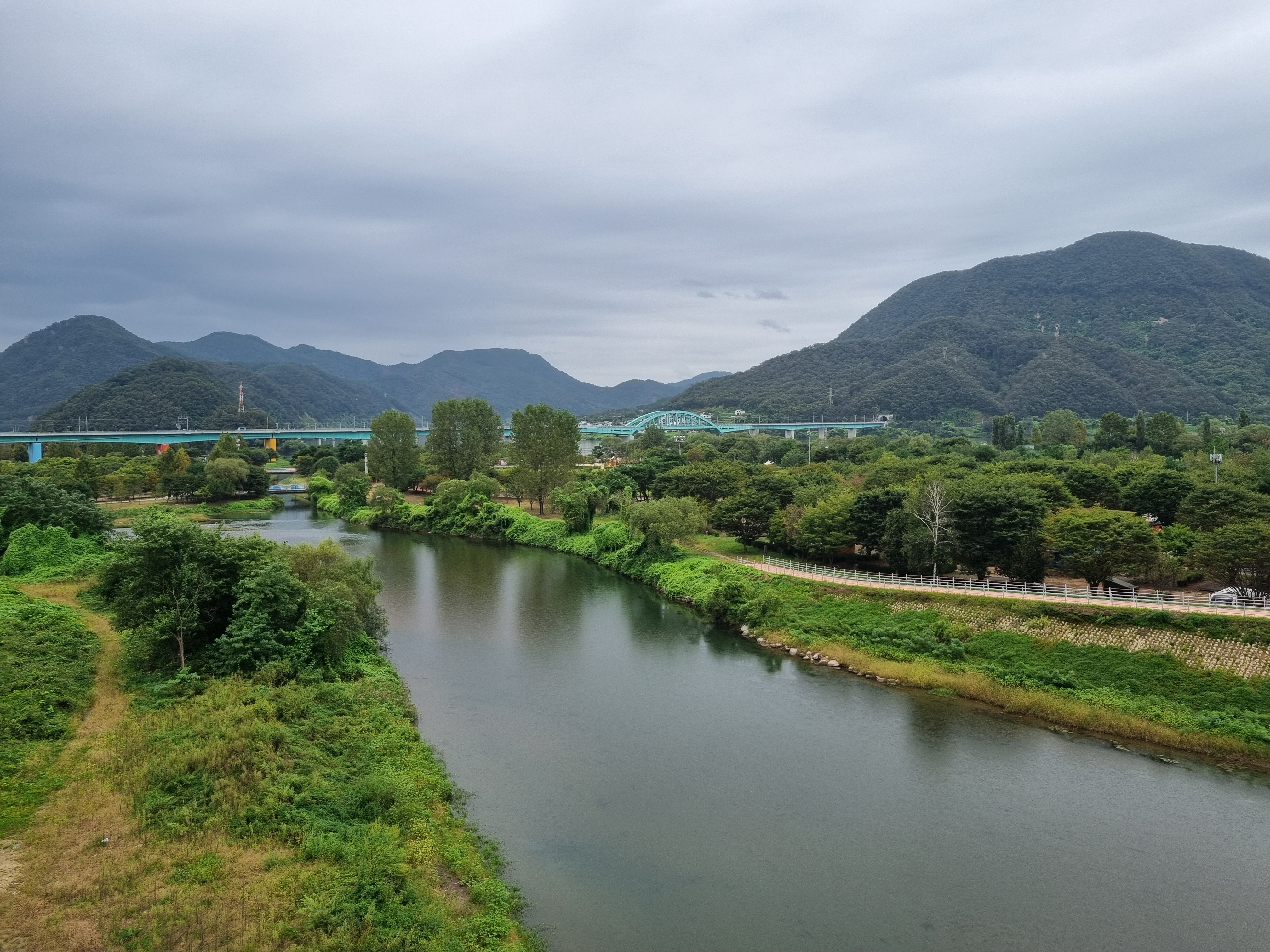 다리 위에서 내려다본 북한강의 풍경이에요. 멀리 보이는 산들과 강이 이어져 평화로운 분위기를 만들어줘요. 초록빛 나무들이 강을 따라 자라 있어서 사계절마다 다른 매력을 보여줄 것 같아요.