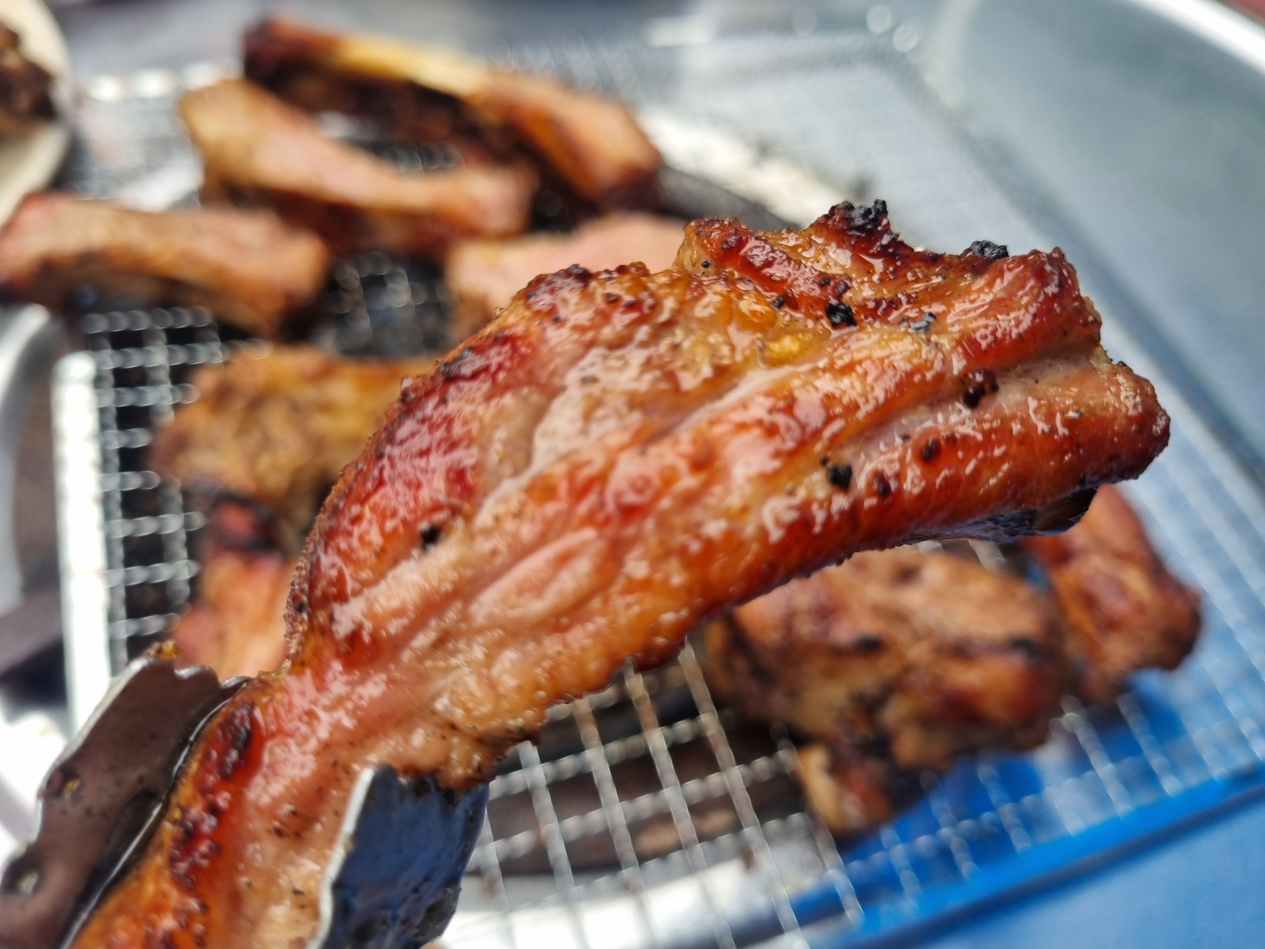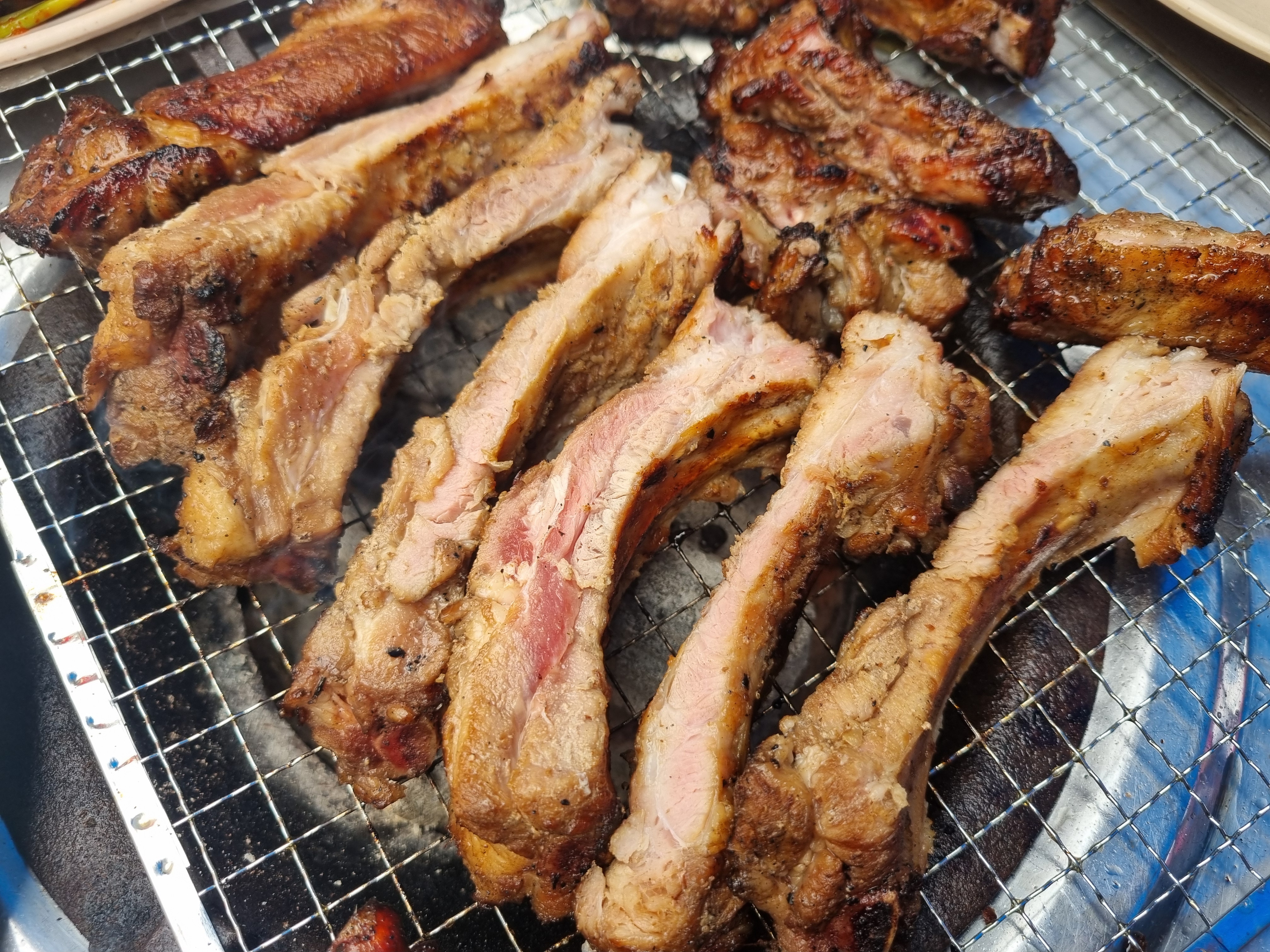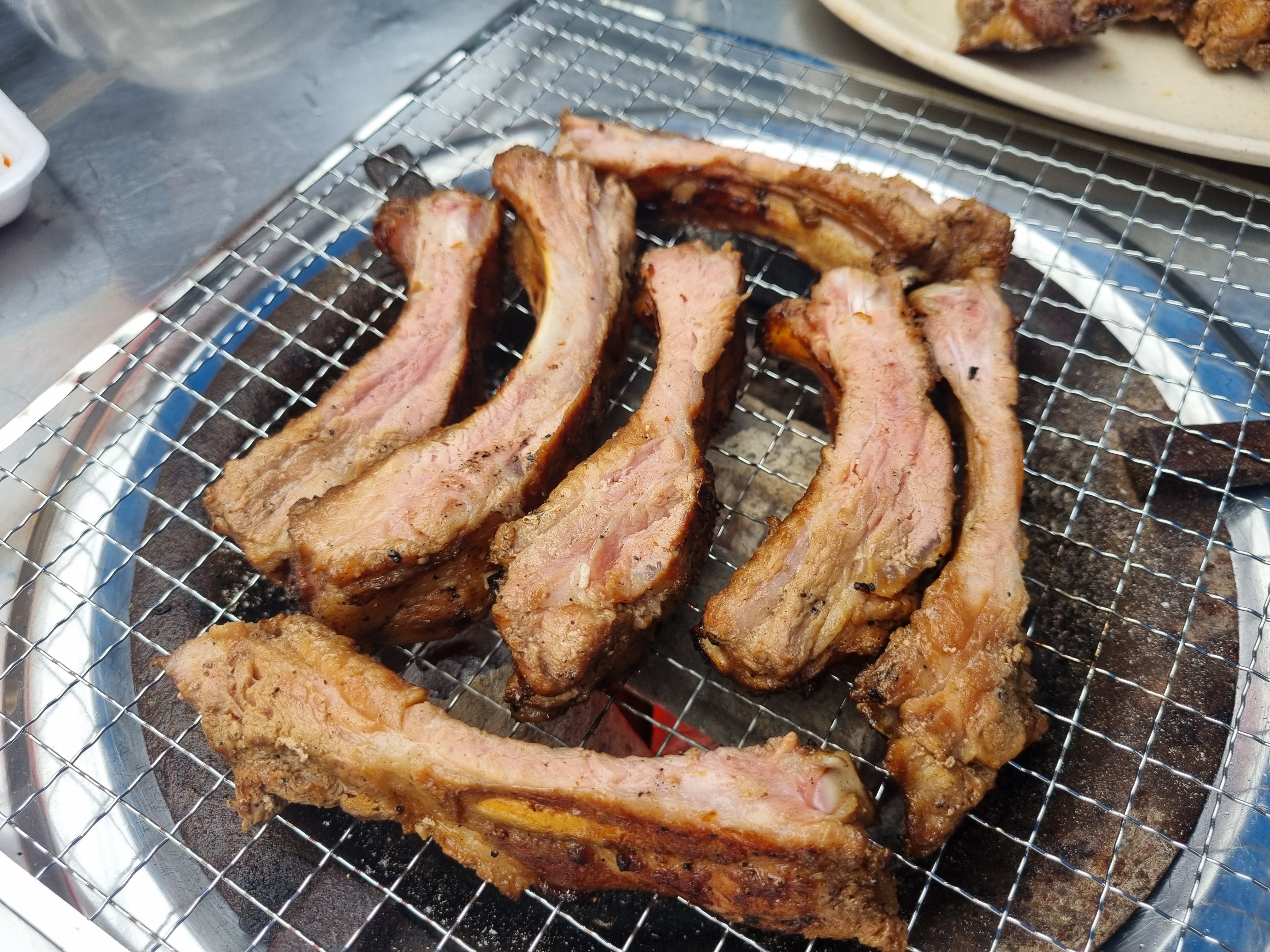 불판 위에서 지글지글 익어가는 등갈비의 모습은 보기만 해도 군침이 돌았어요. 숯불 열기에 고기가 익어가며 겉은 바삭하게, 속은 촉촉하게 유지되고 있었어요. 연기가 피어오르며 퍼지는 고소한 냄새가 시장 가득 퍼졌고, 그 냄새만으로도 이곳의 인기 이유를 알 수 있었어요. 숯의 온도가 일정하게 유지돼 고기 전체가 균일하게 익어 있는 점도 인상적이었어요.