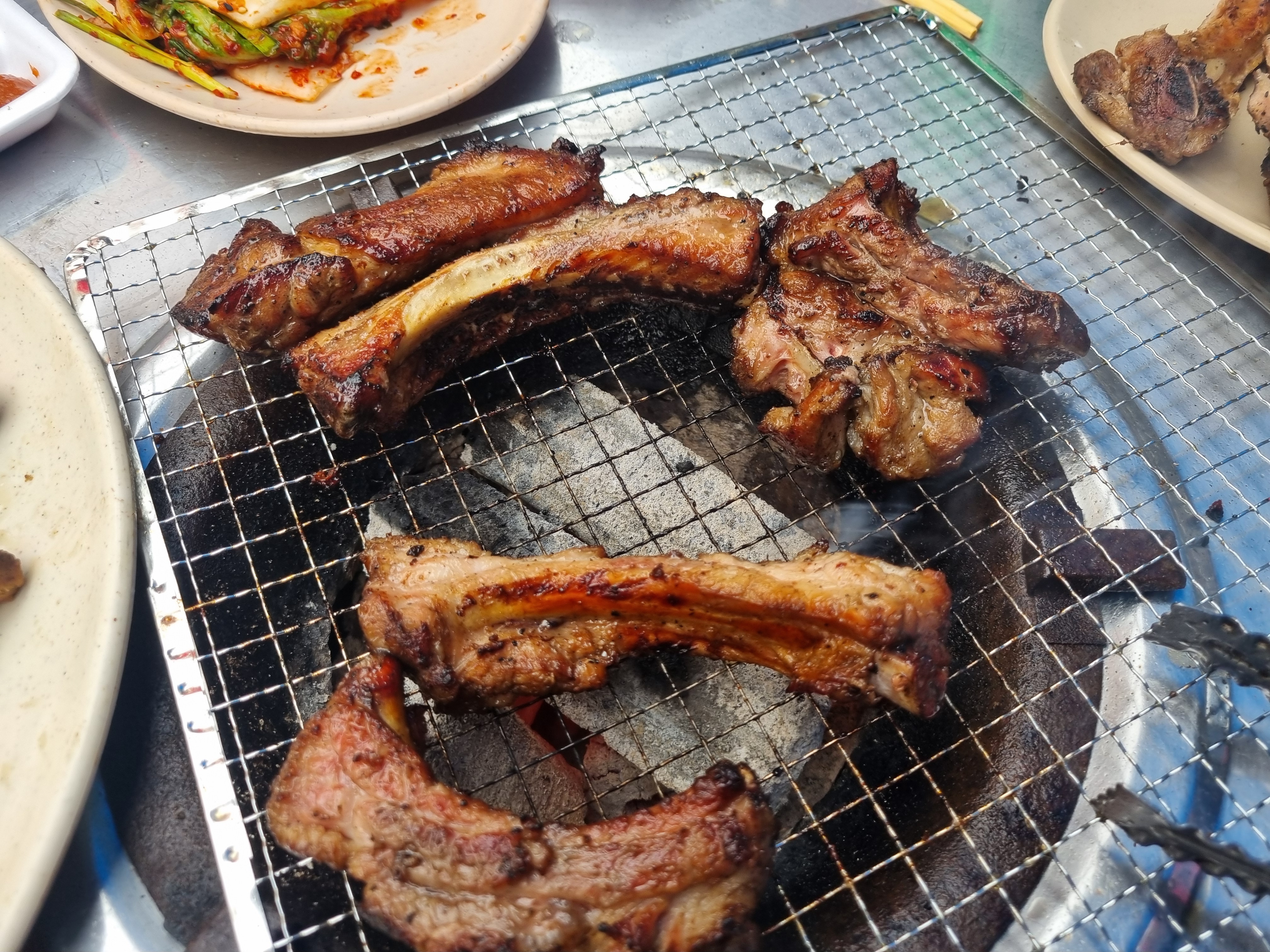 숯불 위에 가지런히 올려진 등갈비들이 구워지는 장면은 시장의 상징 같은 풍경이에요. 불판 아래 붉게 타오르는 숯불에서 나는 은은한 향이 입맛을 돋웠어요. 불 조절이 잘 되어 있어서 타지 않고 노릇하게 익어가고 있었어요. 이 순간만큼은 등갈비의 본고장에 온 듯한 기분이었어요.